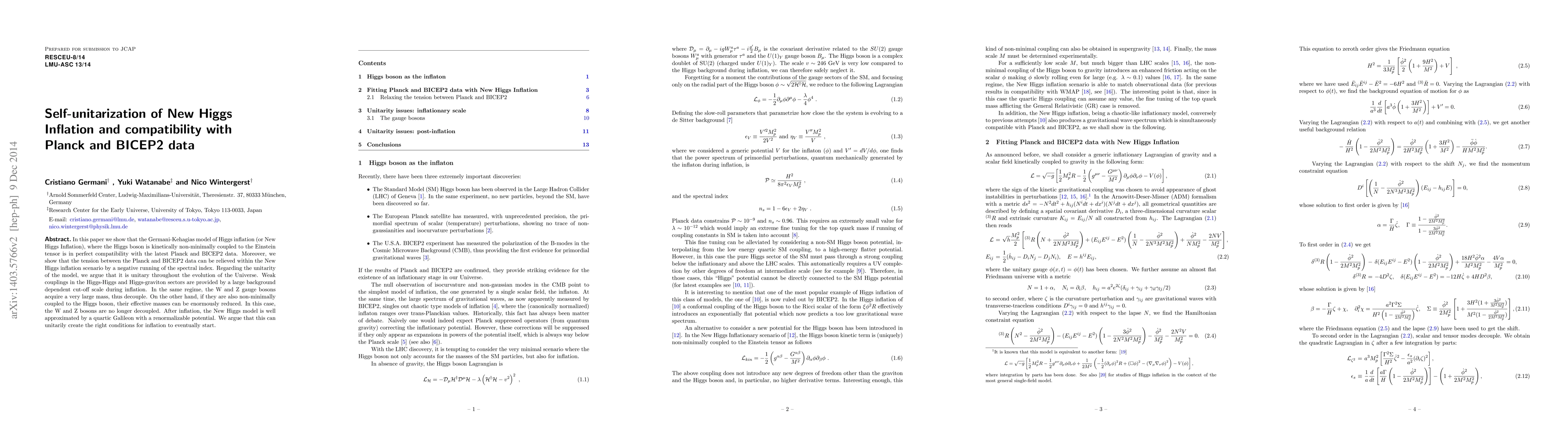 This paper demonstrates that the Germani-Kehagias model of New Higgs Inflation aligns with the latest Planck and BICEP2 data, resolving the tension between the datasets through a negative running spectral index. It also ensures the self-unitarization of the model by introducing a large background-dependent cut-off scale during inflation.