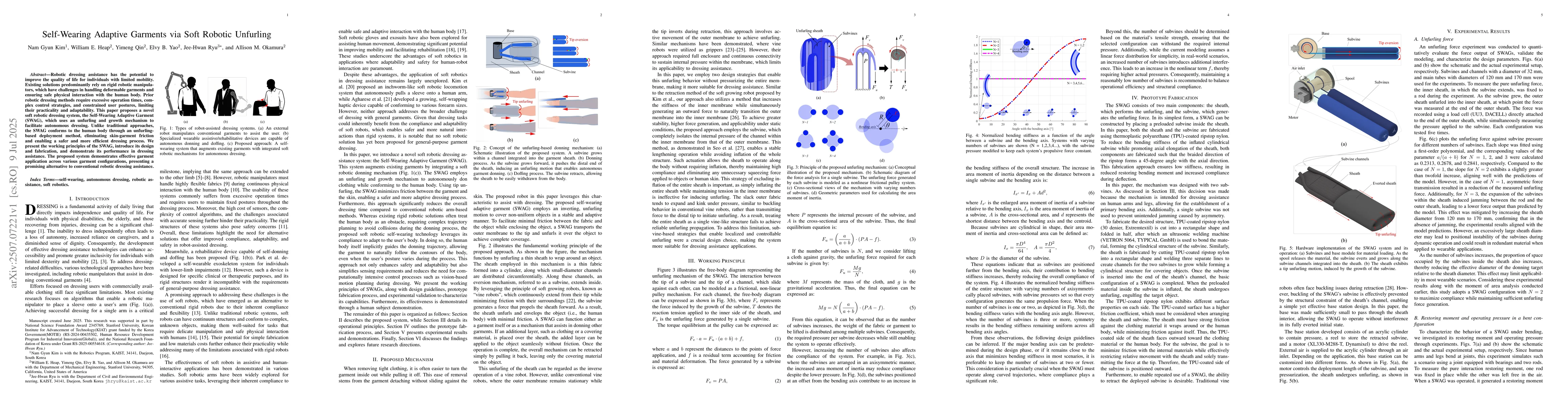 The paper introduces Self-Wearing Adaptive Garment (SWAG), a soft robotic dressing system using an unfurling mechanism for autonomous dressing assistance. Unlike rigid robotic solutions, SWAG conforms to the body, ensuring safe and efficient dressing across various garment types, offering a promising alternative for individuals with limited mobility.