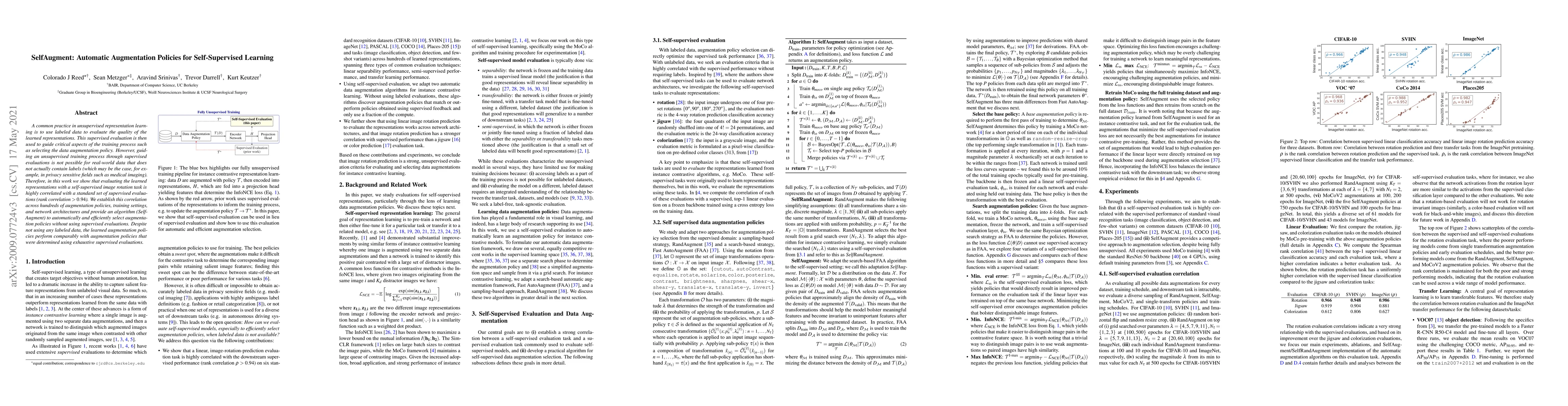 SelfAugment introduces an algorithm to automatically select data augmentation policies for self-supervised learning without relying on labeled data, using a self-supervised rotation task for evaluation. The method demonstrates high correlation with supervised evaluations and achieves comparable performance to policies determined through traditional methods.