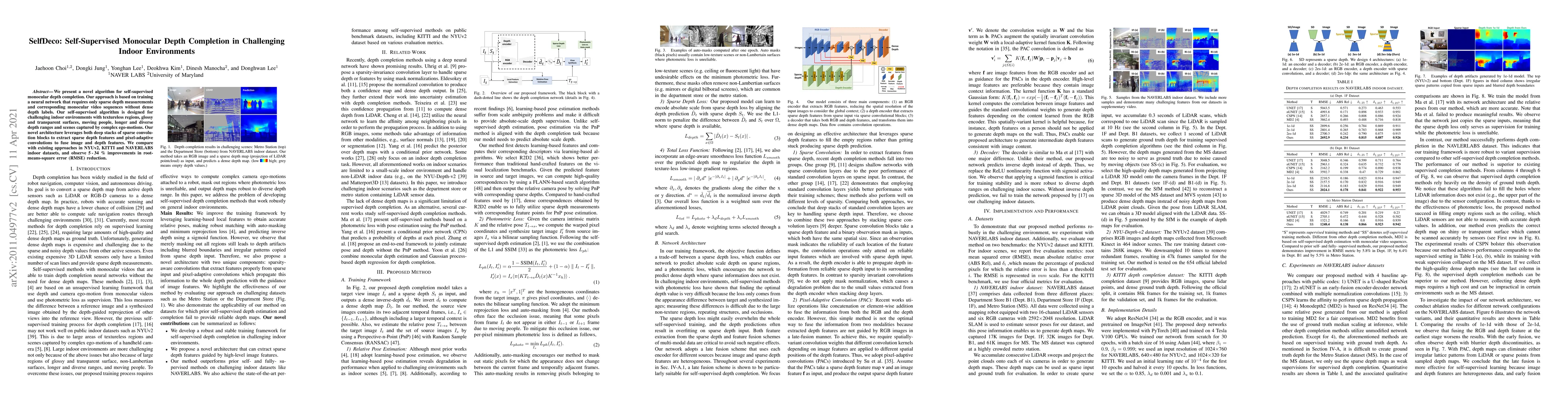 This paper introduces SelfDeco, a self-supervised algorithm for monocular depth completion in complex indoor settings. It leverages sparse depth measurements and video sequences without dense labels, achieving notable improvements in RMSE on NYUv2, KITTI, and NAVERLABS datasets.