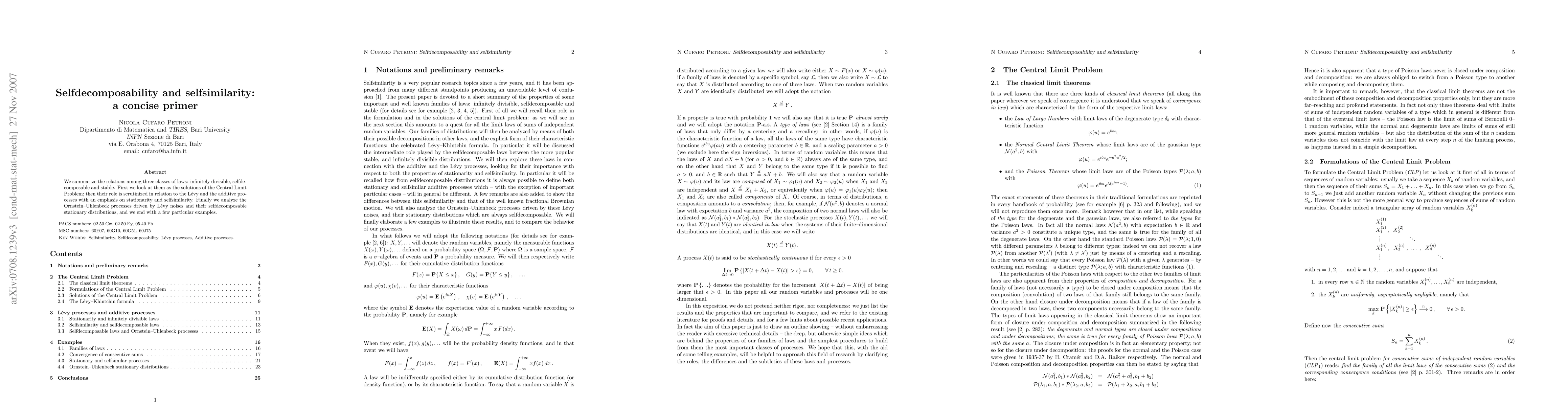 We summarize the relations among three classes of laws: infinitely divisible, selfdecomposable and stable. First we look at them as the solutions of the Central Limit Problem; then their role is scrutinized in relation to the Levy and the additive processes with an emphasis on stationarity and selfsimilarity. Finally we analyze the Ornstein-Uhlenbeck processes driven by Levy noises and their selfdecomposable stationary distributions, and we end with a few particular examples.