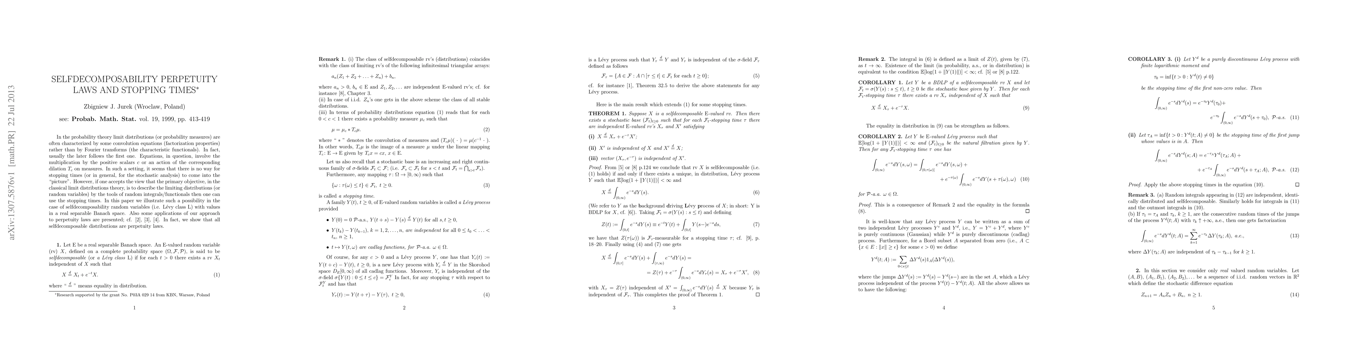 This paper explores the use of stopping times in the context of selfdecomposability and limit distributions, particularly for random variables in a real separable Banach space. It demonstrates that stopping times can be applied to describe limiting distributions through random integrals, and shows that all selfdecomposable distributions are perpetuity laws.