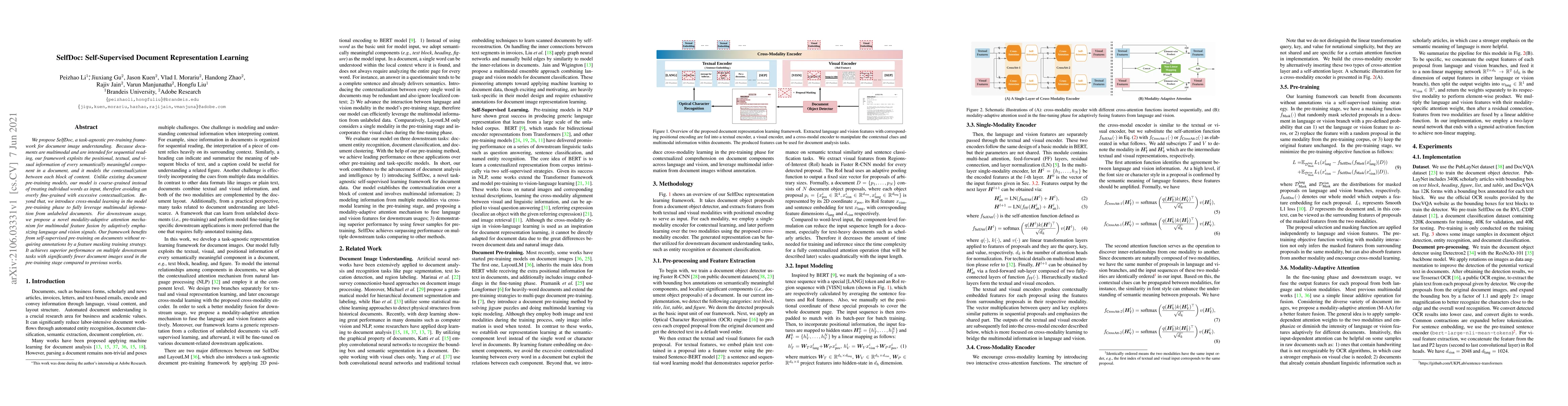 SelfDoc is a self-supervised pre-training framework for document image understanding, leveraging coarse-grained inputs and multimodal information to model contextual relationships. It achieves superior performance on downstream tasks with fewer document images compared to previous methods.