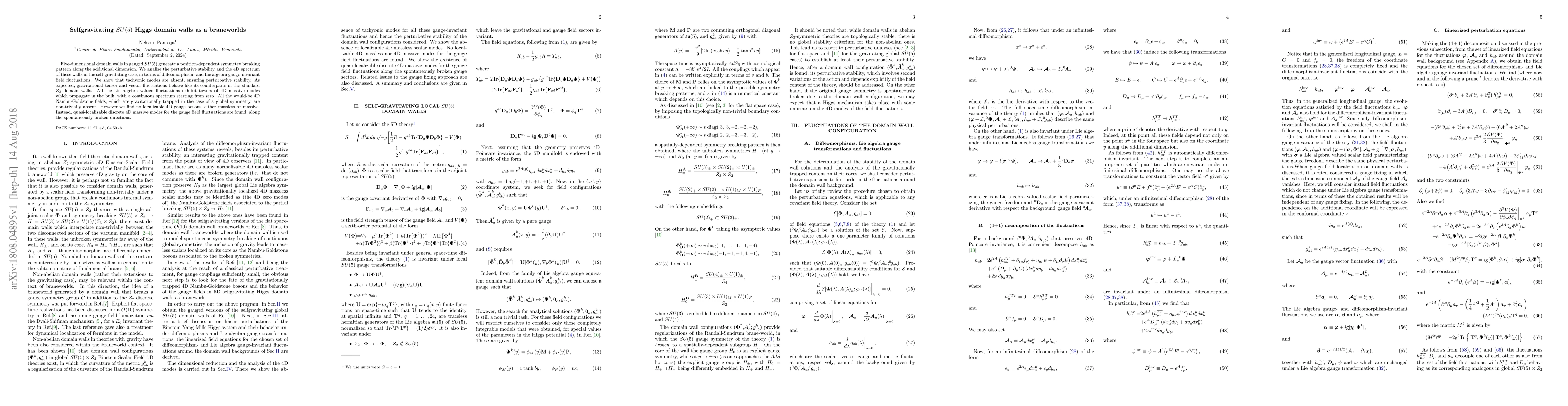 Five-dimensional domain walls in gauged $SU(5)$ generate a position-dependent symmetry breaking pattern along the additional dimension. We analize the perturbative stability and the 4D spectrum of these walls in the self-gravitating case, in terms of diffeomorphism- and Lie algebra gauge-invariant field fluctuations. We show that tachyonic modes are absent, ensuring perturbative stability. As expected, gravitational tensor and vector fluctuations behave like its counterparts in the standard $Z_2$ domain walls. All the Lie algebra valued fluctuations exhibit towers of 4D massive modes which propagate in the bulk, with a continuous spectrum starting from zero. All the would-be 4D Nambu-Goldstone fields, which are gravitationally trapped in the case of a global symmetry, are non-trivially absent. However we find no localizable 4D gauge bosons, either massless or massive. Instead, quasi-localizable discrete 4D massive modes for the gauge field fluctuations are found, along the spontaneously broken directions.