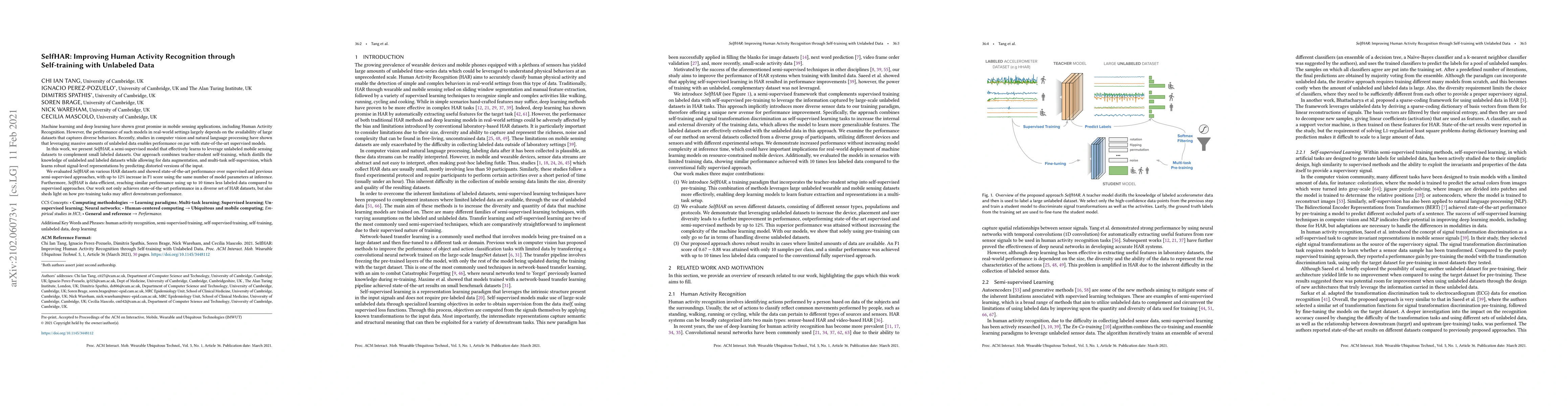 Machine learning and deep learning have shown great promise in mobile sensing applications, including Human Activity Recognition. However, the performance of such models in real-world settings largely depends on the availability of large datasets that captures diverse behaviors. Recently, studies in computer vision and natural language processing have shown that leveraging massive amounts of unlabeled data enables performance on par with state-of-the-art supervised models. In this work, we present SelfHAR, a semi-supervised model that effectively learns to leverage unlabeled mobile sensing datasets to complement small labeled datasets. Our approach combines teacher-student self-training, which distills the knowledge of unlabeled and labeled datasets while allowing for data augmentation, and multi-task self-supervision, which learns robust signal-level representations by predicting distorted versions of the input. We evaluated SelfHAR on various HAR datasets and showed state-of-the-art performance over supervised and previous semi-supervised approaches, with up to 12% increase in F1 score using the same number of model parameters at inference. Furthermore, SelfHAR is data-efficient, reaching similar performance using up to 10 times less labeled data compared to supervised approaches. Our work not only achieves state-of-the-art performance in a diverse set of HAR datasets, but also sheds light on how pre-training tasks may affect downstream performance.