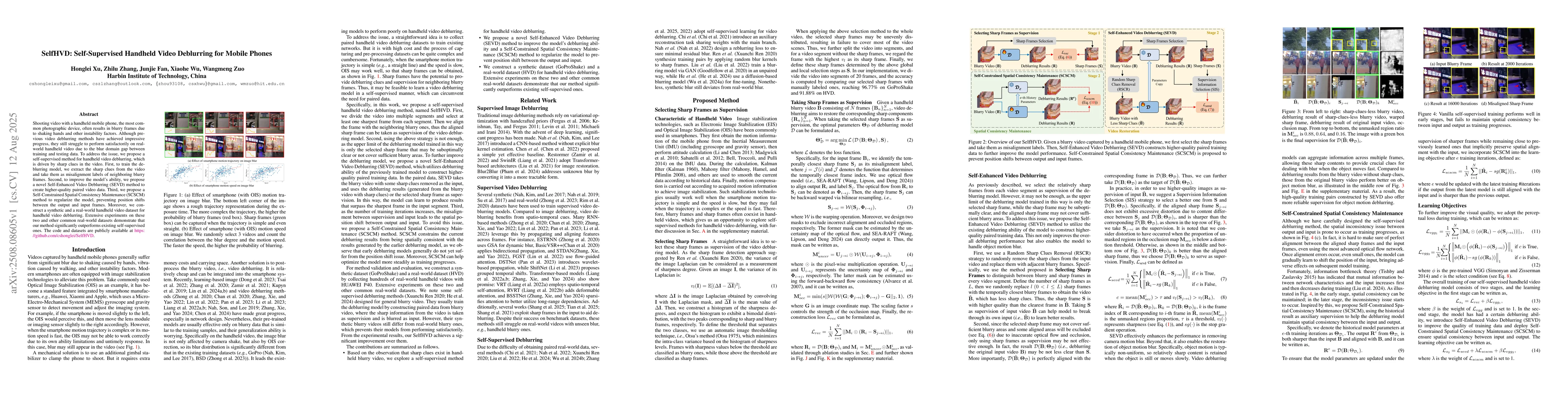 Shooting video with a handheld mobile phone, the most common photographic device, often results in blurry frames due to shaking hands and other instability factors. Although previous video deblurring methods have achieved impressive progress, they still struggle to perform satisfactorily on real-world handheld video due to the blur domain gap between training and testing data. To address the issue, we propose a self-supervised method for handheld video deblurring, which is driven by sharp clues in the video. First, to train the deblurring model, we extract the sharp clues from the video and take them as misalignment labels of neighboring blurry frames. Second, to improve the model's ability, we propose a novel Self-Enhanced Video Deblurring (SEVD) method to create higher-quality paired video data. Third, we propose a Self-Constrained Spatial Consistency Maintenance (SCSCM) method to regularize the model, preventing position shifts between the output and input frames. Moreover, we construct a synthetic and a real-world handheld video dataset for handheld video deblurring. Extensive experiments on these two and other common real-world datasets demonstrate that our method significantly outperforms existing self-supervised ones. The code and datasets are publicly available at https://github.com/cshonglei/SelfHVD.