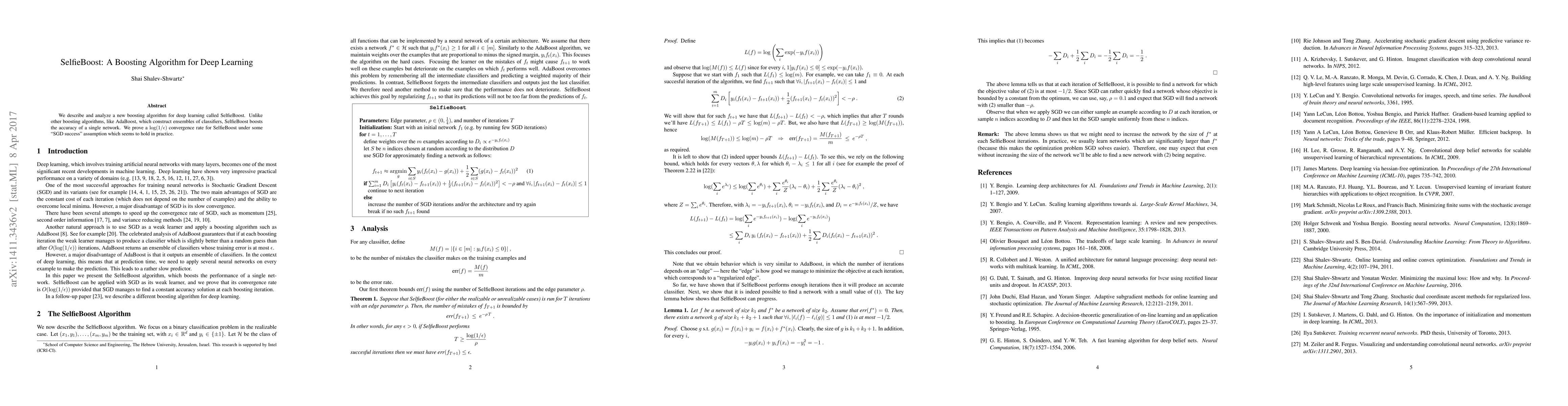 A new boosting algorithm called SelfieBoost improves single deep learning network accuracy without creating ensembles of classifiers. It achieves a convergence rate that matches or exceeds traditional methods like AdaBoost.