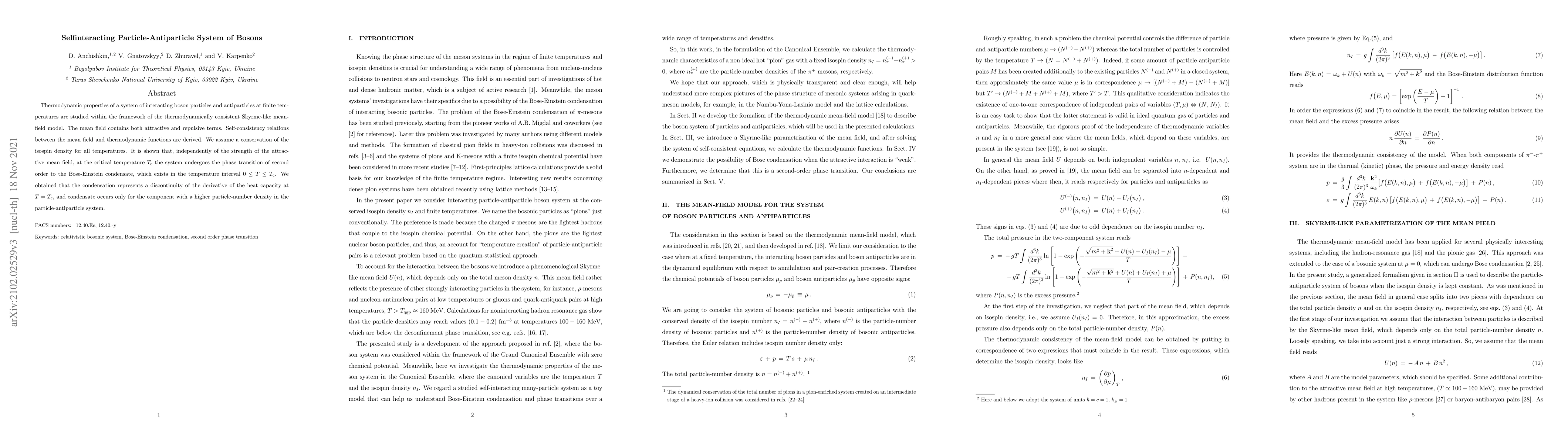 Thermodynamic properties of a system of interacting boson particles and antiparticles at finite temperatures are studied within the framework of the thermodynamically consistent Skyrme-like mean-field model. The mean field contains both attractive and repulsive terms. Self-consistency relations between the mean field and thermodynamic functions are derived. We assume conservation of the isospin density for all temperatures. It is shown that, independently of the strength of the attractive mean field, at the critical temperature $T_{\rm c}$ the system undergoes the phase transition of second-order to the Bose-Einstein condensate, which exists in the temperature interval $0 \le T \le T_{\rm c}$. We obtained that the condensation represents a discontinuity of the derivative of the heat capacity at $T = T_{\rm c}$, and condensate occurs only for the component with a higher particle-number density in the particle-antiparticle system.