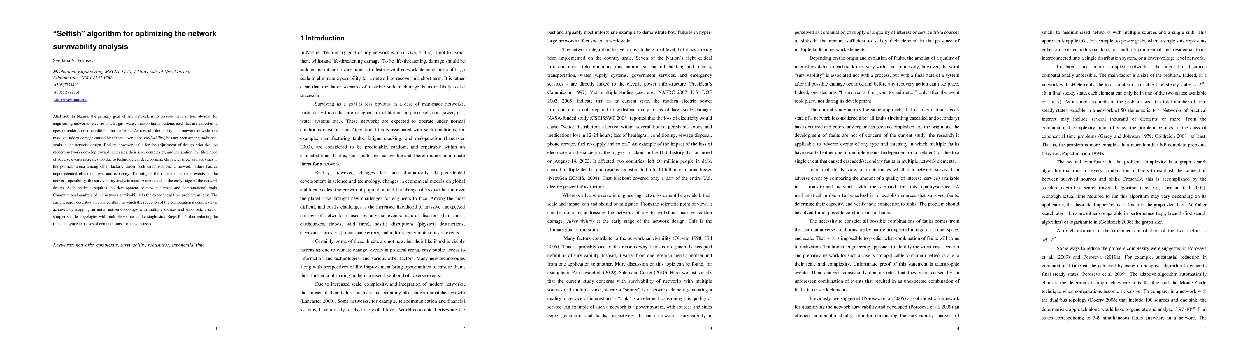 In Nature, the primary goal of any network is to survive. This is less obvious for engineering networks (electric power, gas, water, transportation systems etc.) that are expected to operate under normal conditions most of time. As a result, the ability of a network to withstand massive sudden damage caused by adverse events (or survivability) has not been among traditional goals in the network design. Reality, however, calls for the adjustment of design priorities. As modern networks develop toward increasing their size, complexity, and integration, the likelihood of adverse events increases too due to technological development, climate change, and activities in the political arena among other factors. Under such circumstances, a network failure has an unprecedented effect on lives and economy. To mitigate the impact of adverse events on the network operability, the survivability analysis must be conducted at the early stage of the network design. Such analysis requires the development of new analytical and computational tools. Computational analysis of the network survivability is the exponential time problem at least. The current paper describes a new algorithm, in which the reduction of the computational complexity is achieved by mapping an initial network topology with multiple sources and sinks onto a set of simpler smaller topologies with multiple sources and a single sink. Steps for further reducing the time and space expenses of computations are also discussed.
