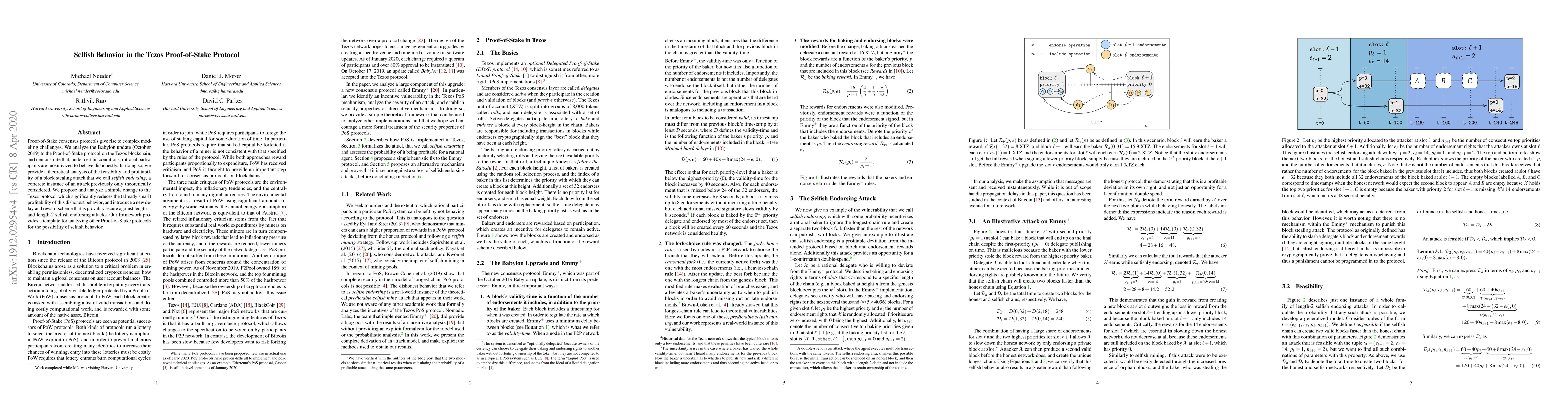 The paper presents a theoretical analysis of selfish behavior in the Tezos Proof-of-Stake protocol, proposes a heuristic fix to reduce such attacks, and introduces a new delay and reward scheme that is provably secure against specific selfish endorsing attacks.