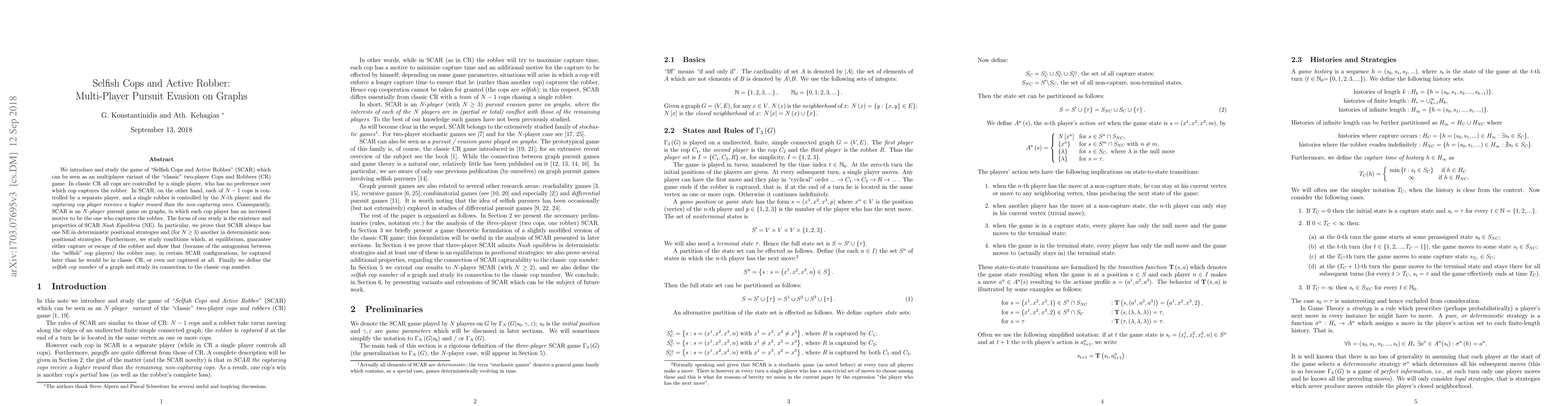 This paper studies the multiplayer game "Selfish Cops and Active Robber" (SCAR), an extension of the classic Cops and Robbers game where each of the N-1 cops is controlled by a separate player, and the N-th player controls the robber. The study focuses on the existence of SCAR Nash Equilibria, proving the existence of equilibria in both deterministic positional and nonpositional strategies, and exploring conditions under which the robber may escape or be captured later than in the classic game.