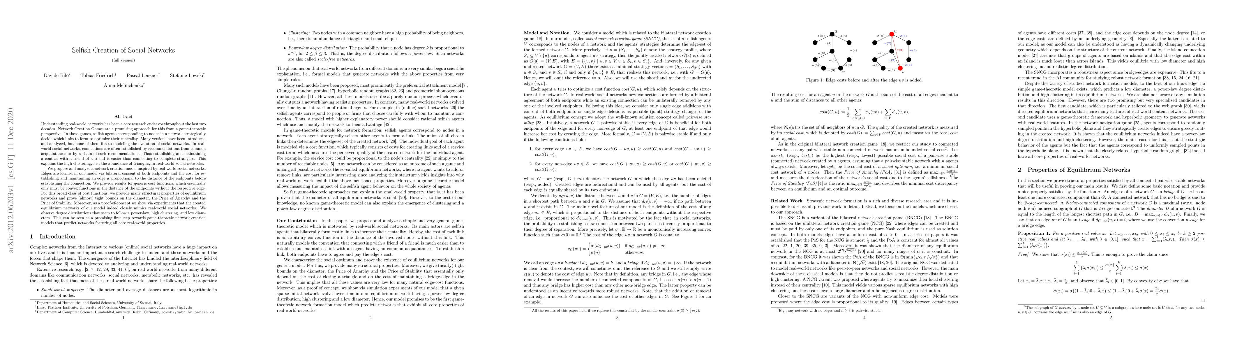 This paper proposes a game-theoretic model for the creation of social networks where nodes form connections based on mutual consent and the cost of connection is related to the distance between nodes. The model demonstrates that equilibrium networks exhibit properties like high clustering, power-law degree distributions, and low diameters, closely mimicking real-world social networks.