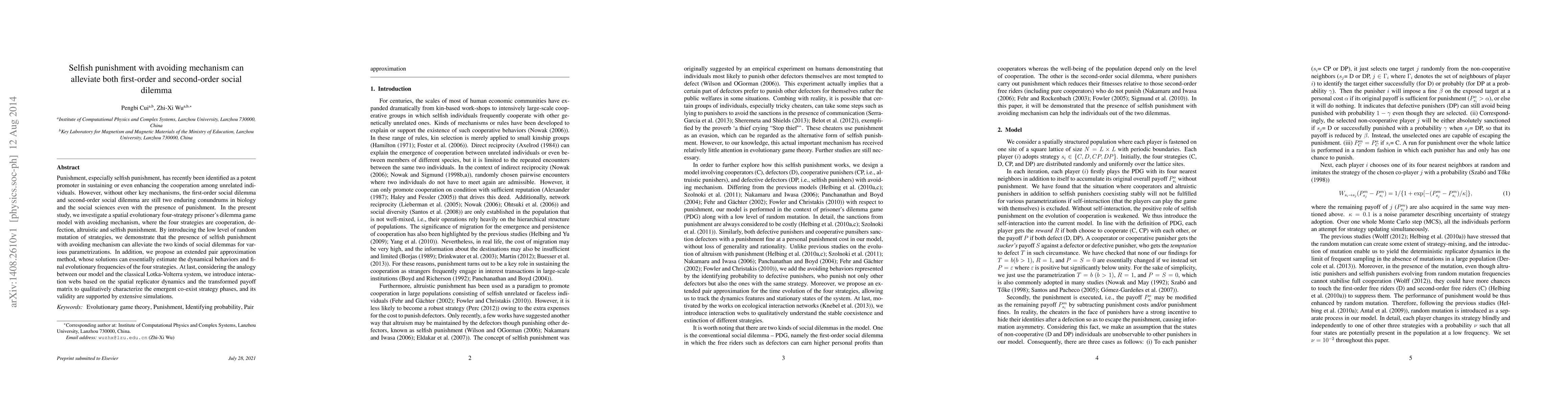 Researchers found that incorporating selfish punishment with an avoiding mechanism can help alleviate both first-order and second-order social dilemmas, improving cooperation among individuals in a prisoner's dilemma game model.
