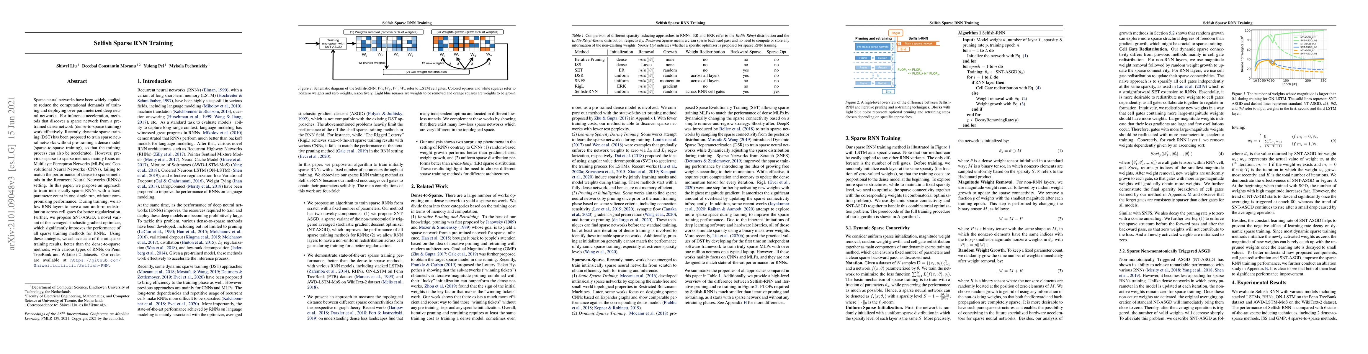 Sparse neural networks have been widely applied to reduce the computational demands of training and deploying over-parameterized deep neural networks. For inference acceleration, methods that discover a sparse network from a pre-trained dense network (dense-to-sparse training) work effectively. Recently, dynamic sparse training (DST) has been proposed to train sparse neural networks without pre-training a dense model (sparse-to-sparse training), so that the training process can also be accelerated. However, previous sparse-to-sparse methods mainly focus on Multilayer Perceptron Networks (MLPs) and Convolutional Neural Networks (CNNs), failing to match the performance of dense-to-sparse methods in the Recurrent Neural Networks (RNNs) setting. In this paper, we propose an approach to train intrinsically sparse RNNs with a fixed parameter count in one single run, without compromising performance. During training, we allow RNN layers to have a non-uniform redistribution across cell gates for better regularization. Further, we propose SNT-ASGD, a novel variant of the averaged stochastic gradient optimizer, which significantly improves the performance of all sparse training methods for RNNs. Using these strategies, we achieve state-of-the-art sparse training results, better than the dense-to-sparse methods, with various types of RNNs on Penn TreeBank and Wikitext-2 datasets. Our codes are available at https://github.com/Shiweiliuiiiiiii/Selfish-RNN.