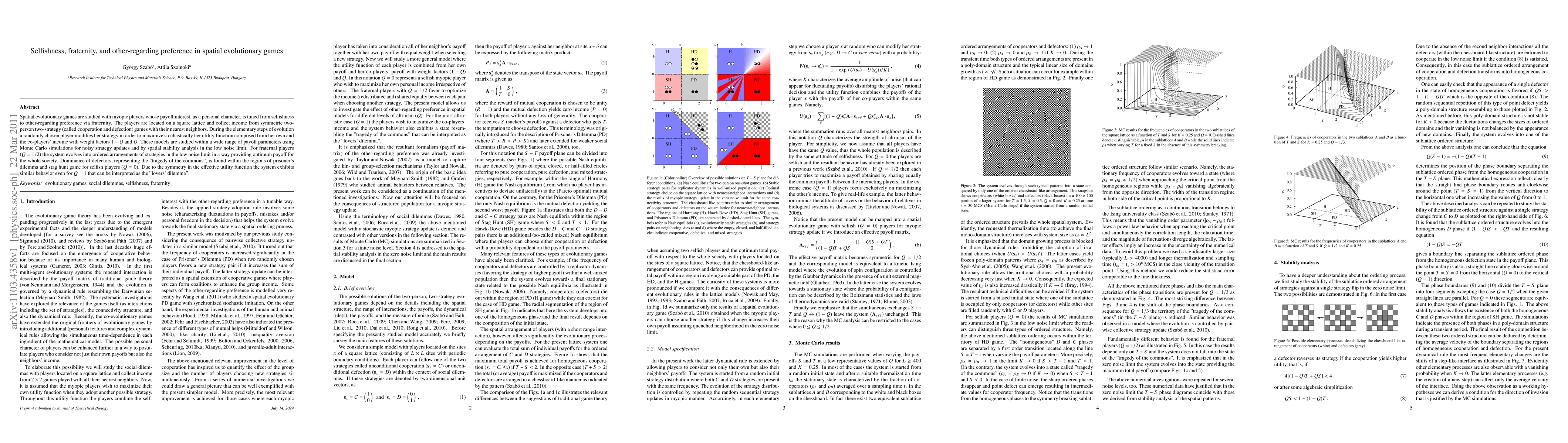 This paper explores spatial evolutionary games with players exhibiting varying degrees of selfishness to other-regarding preference through fraternity, using Monte Carlo simulations to analyze strategy evolution. Fraternal players (Q=1/2) achieve optimal societal payoff, while selfish players (Q=0) tend towards the "tragedy of the commons," and even altruistic players (Q=1) show similar dynamics.