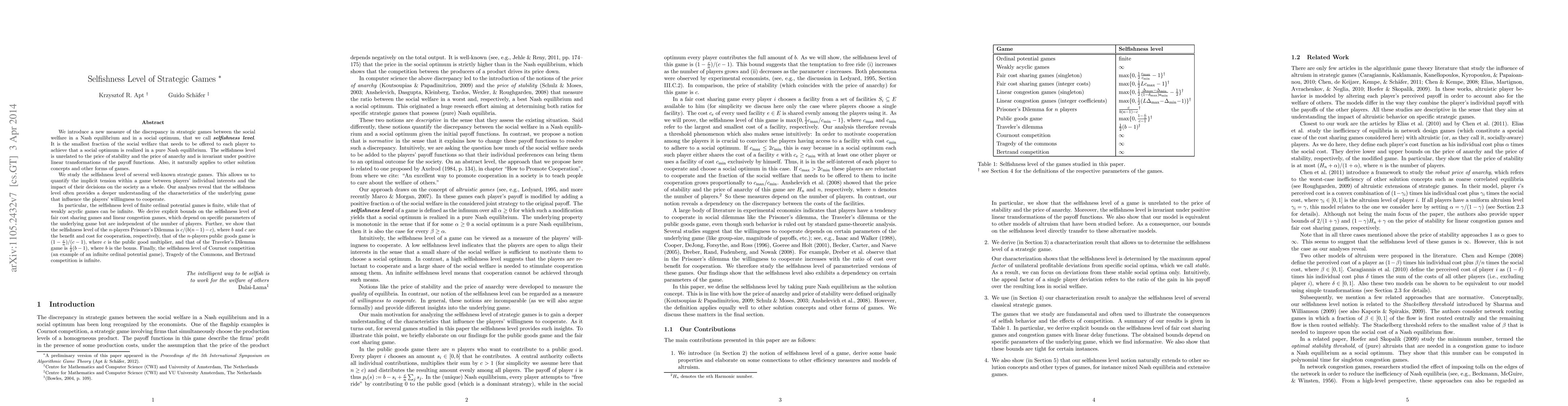 This paper introduces a new measure called the "selfishness level" to quantify the discrepancy between social welfare in Nash equilibrium and social optimum in strategic games. It reveals that the selfishness level often provides deeper insights into the cooperation dynamics within games, with specific findings for various game types, including finite ordinal potential games, weakly acyclic games, and the Prisoner's Dilemma.