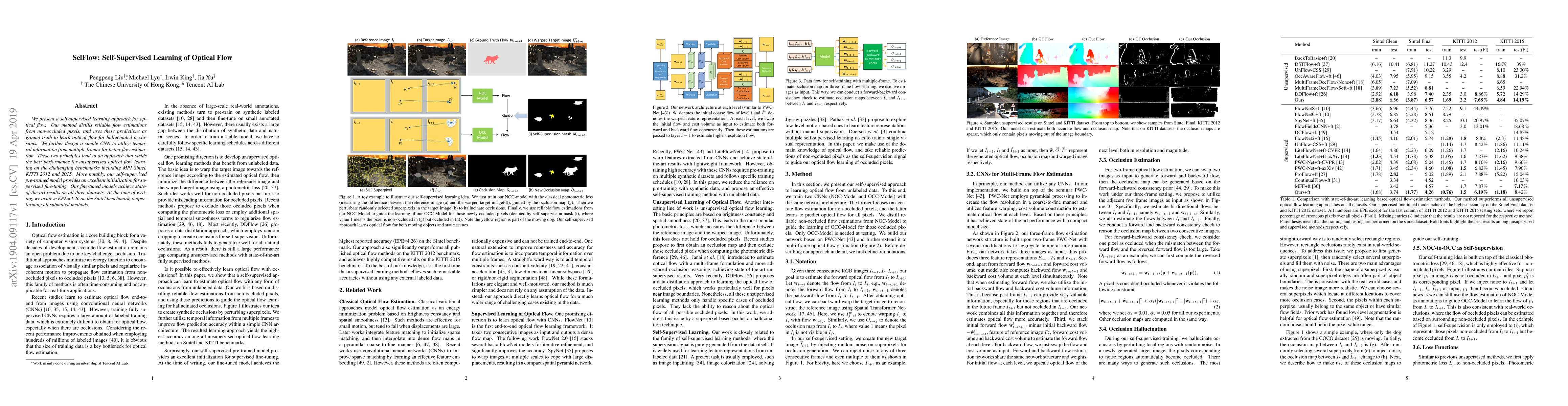 SelFlow introduces a self-supervised learning method for optical flow, leveraging non-occluded pixel predictions and temporal information from multiple frames to achieve state-of-the-art performance on MPI Sintel, KITTI 2012, and KITTI 2015 benchmarks, and serves as an excellent initialization for supervised fine-tuning.