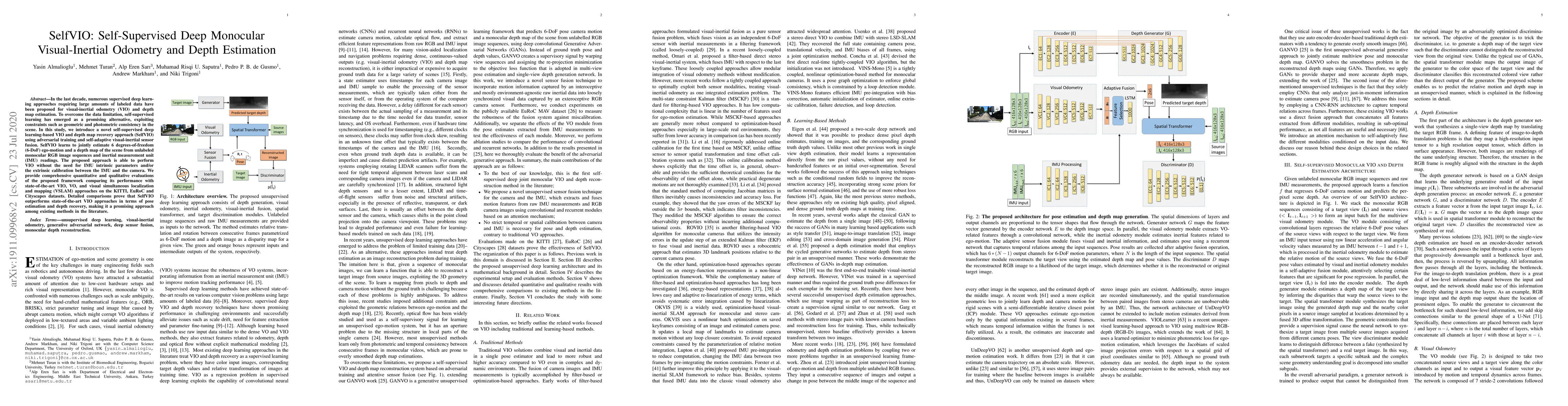 SelfVIO is a self-supervised deep learning method for monocular visual-inertial odometry and depth estimation, leveraging adversarial training and sensor fusion without requiring labeled data or IMU calibration. It outperforms state-of-the-art methods in pose estimation and depth recovery on multiple datasets.
