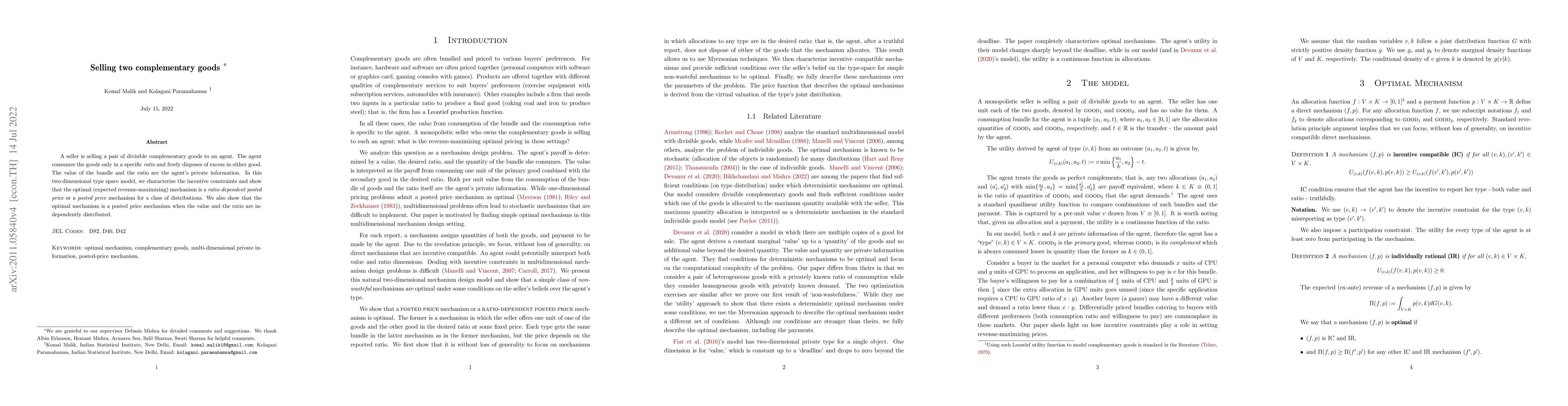 This paper explores the optimal pricing mechanism for selling two complementary goods where the agent's valuation and consumption ratio are private. The authors find that the best revenue-maximizing strategy is either a ratio-dependent posted price or a standard posted price mechanism under certain distribution assumptions.
