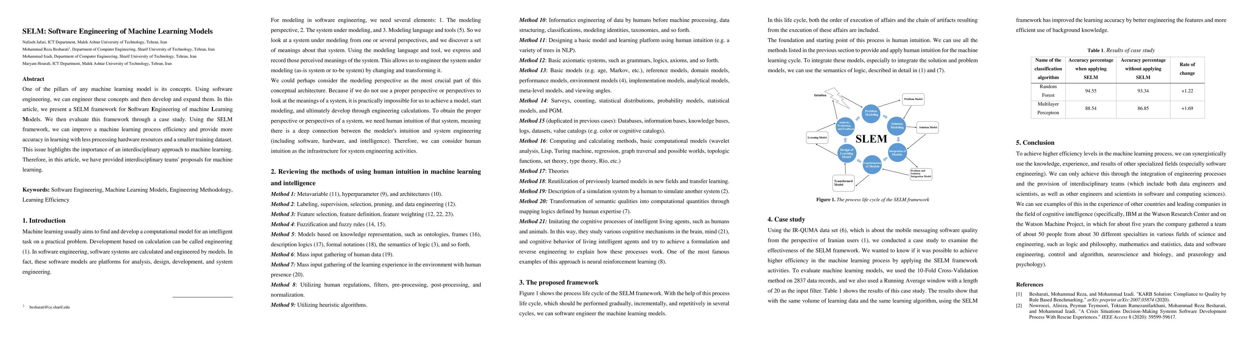 The SELM framework integrates software engineering principles into machine learning model development, enhancing efficiency and accuracy with reduced hardware and dataset requirements. The study demonstrates its effectiveness through a case study, emphasizing the value of interdisciplinary collaboration in machine learning.