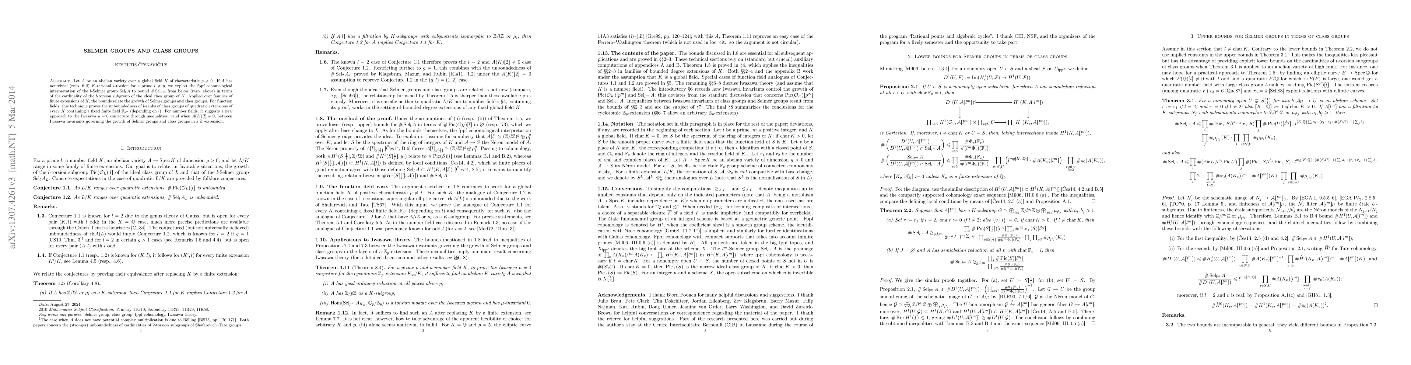 This paper explores the relationship between Selmer groups and class groups of abelian varieties over global fields, using fppf cohomological interpretations to provide bounds on Selmer group sizes in terms of class group torsion. The results suggest a new approach to the Iwasawa conjecture and demonstrate unboundedness of class group $l$-ranks for quadratic extensions.