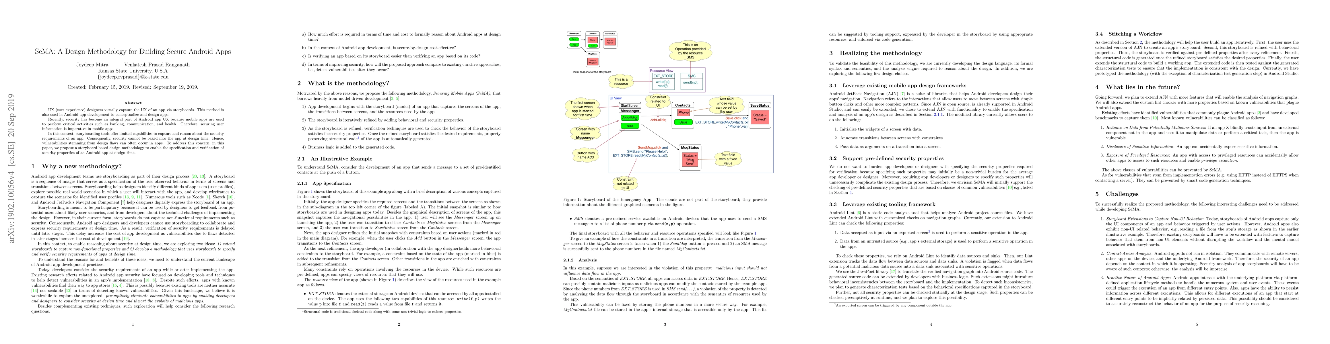 Title: SeMA: A Design Methodology for Building Secure Android Apps Summary: This paper proposes a storyboard-based design methodology, SeMA, to integrate security requirements into the Android app design process, enabling the specification and verification of security properties at the design stage to mitigate vulnerabilities.