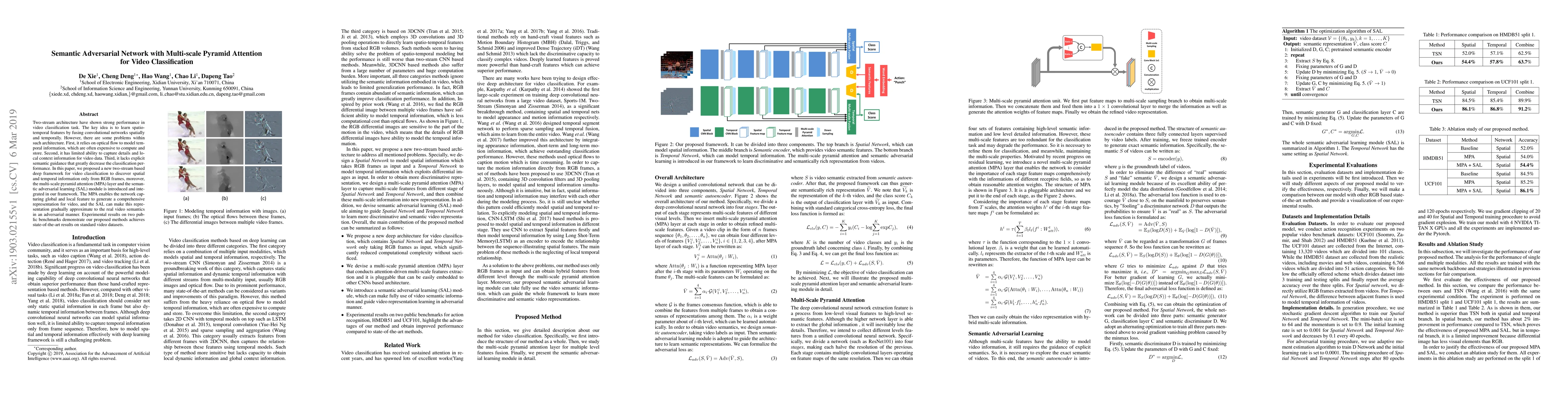 This paper proposes a two-stream deep framework for video classification using RGB frames, integrating multi-scale pyramid attention and semantic adversarial learning to capture spatial and temporal features without relying on optical flow. The results show state-of-the-art performance on standard video datasets.