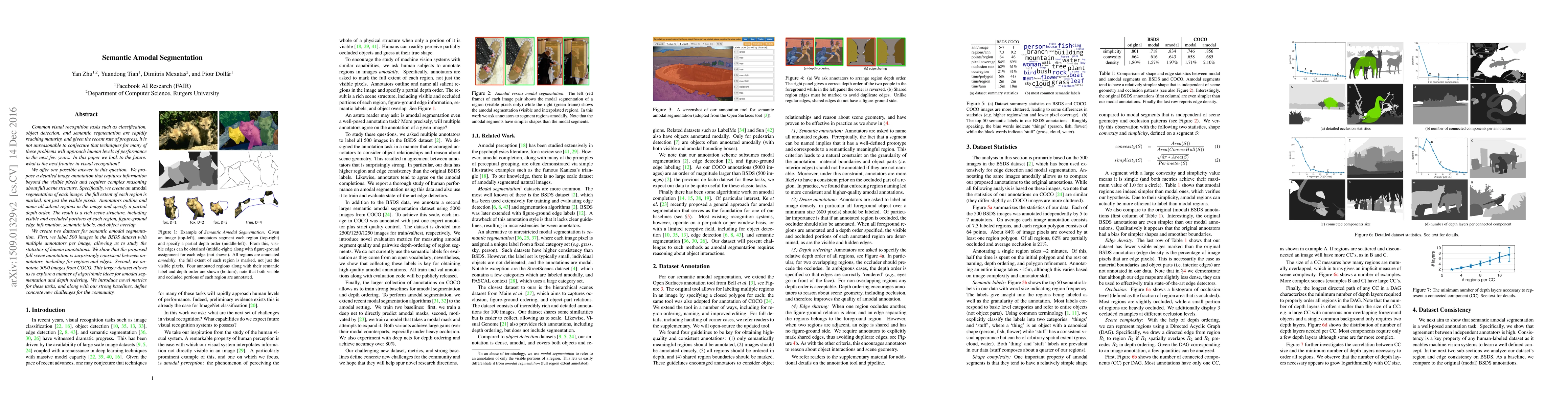 Common visual recognition tasks such as classification, object detection, and semantic segmentation are rapidly reaching maturity, and given the recent rate of progress, it is not unreasonable to conjecture that techniques for many of these problems will approach human levels of performance in the next few years. In this paper we look to the future: what is the next frontier in visual recognition? We offer one possible answer to this question. We propose a detailed image annotation that captures information beyond the visible pixels and requires complex reasoning about full scene structure. Specifically, we create an amodal segmentation of each image: the full extent of each region is marked, not just the visible pixels. Annotators outline and name all salient regions in the image and specify a partial depth order. The result is a rich scene structure, including visible and occluded portions of each region, figure-ground edge information, semantic labels, and object overlap. We create two datasets for semantic amodal segmentation. First, we label 500 images in the BSDS dataset with multiple annotators per image, allowing us to study the statistics of human annotations. We show that the proposed full scene annotation is surprisingly consistent between annotators, including for regions and edges. Second, we annotate 5000 images from COCO. This larger dataset allows us to explore a number of algorithmic ideas for amodal segmentation and depth ordering. We introduce novel metrics for these tasks, and along with our strong baselines, define concrete new challenges for the community.