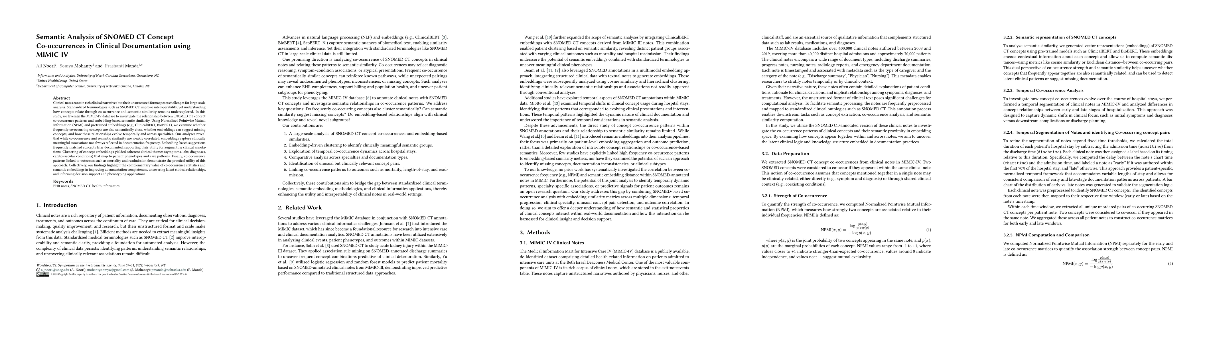 Clinical notes contain rich clinical narratives but their unstructured format poses challenges for large-scale analysis. Standardized terminologies such as SNOMED CT improve interoperability, yet understanding how concepts relate through co-occurrence and semantic similarity remains underexplored. In this study, we leverage the MIMIC-IV database to investigate the relationship between SNOMED CT concept co-occurrence patterns and embedding-based semantic similarity. Using Normalized Pointwise Mutual Information (NPMI) and pretrained embeddings (e.g., ClinicalBERT, BioBERT), we examine whether frequently co-occurring concepts are also semantically close, whether embeddings can suggest missing concepts, and how these relationships evolve temporally and across specialties. Our analyses reveal that while co-occurrence and semantic similarity are weakly correlated, embeddings capture clinically meaningful associations not always reflected in documentation frequency. Embedding-based suggestions frequently matched concepts later documented, supporting their utility for augmenting clinical annotations. Clustering of concept embeddings yielded coherent clinical themes (symptoms, labs, diagnoses, cardiovascular conditions) that map to patient phenotypes and care patterns. Finally, co-occurrence patterns linked to outcomes such as mortality and readmission demonstrate the practical utility of this approach. Collectively, our findings highlight the complementary value of co-occurrence statistics and semantic embeddings in improving documentation completeness, uncovering latent clinical relationships, and informing decision support and phenotyping applications.