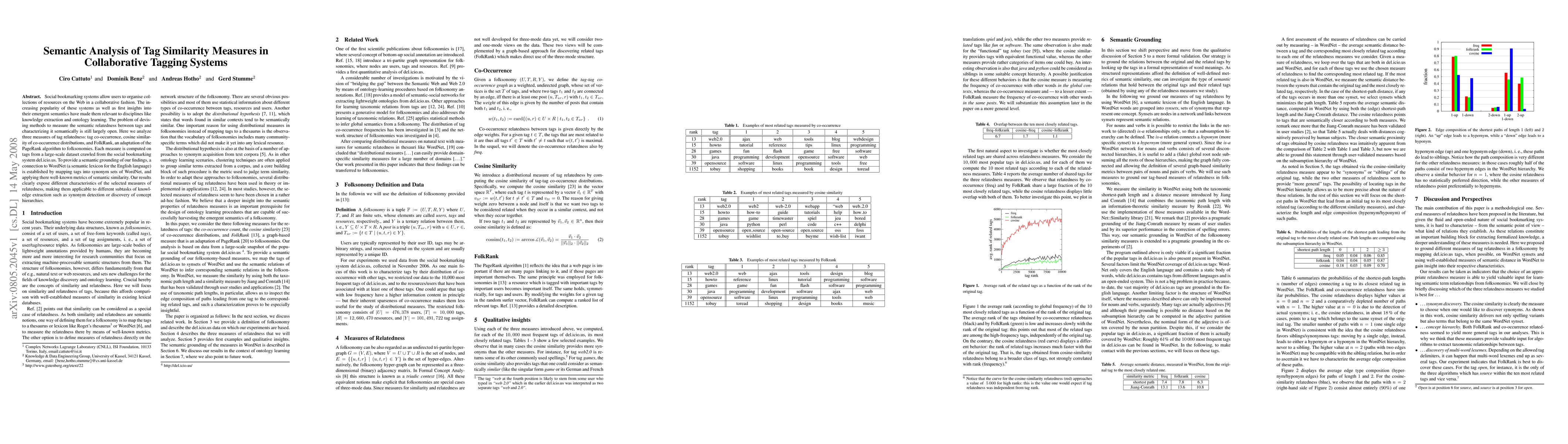 Social bookmarking systems allow users to organise collections of resources on the Web in a collaborative fashion. The increasing popularity of these systems as well as first insights into their emergent semantics have made them relevant to disciplines like knowledge extraction and ontology learning. The problem of devising methods to measure the semantic relatedness between tags and characterizing it semantically is still largely open. Here we analyze three measures of tag relatedness: tag co-occurrence, cosine similarity of co-occurrence distributions, and FolkRank, an adaptation of the PageRank algorithm to folksonomies. Each measure is computed on tags from a large-scale dataset crawled from the social bookmarking system del.icio.us. To provide a semantic grounding of our findings, a connection to WordNet (a semantic lexicon for the English language) is established by mapping tags into synonym sets of WordNet, and applying there well-known metrics of semantic similarity. Our results clearly expose different characteristics of the selected measures of relatedness, making them applicable to different subtasks of knowledge extraction such as synonym detection or discovery of concept hierarchies.