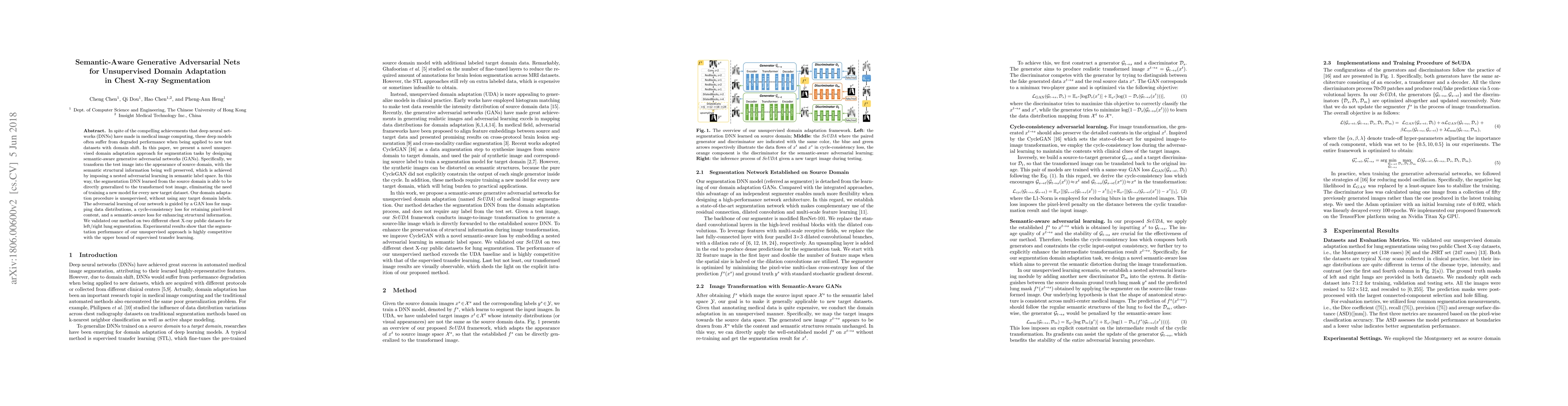 This paper introduces a novel unsupervised domain adaptation method using semantic-aware generative adversarial networks (GANs) to improve chest X-ray lung segmentation across different datasets. The method effectively transforms test images to match the source domain while preserving semantic structural information, achieving competitive results without target domain labels.