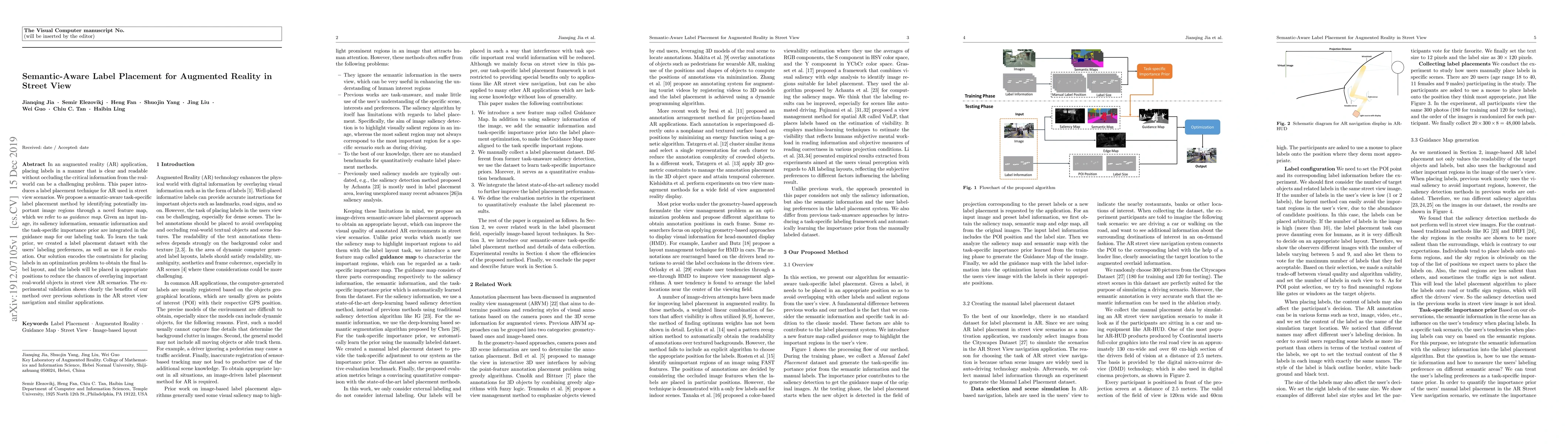 This paper proposes a semantic-aware label placement method for augmented reality in street view applications, using a guidance map to identify important image regions and optimize label placement to avoid occlusion of critical real-world objects. Experimental results demonstrate superior performance over previous methods in AR street view navigation.