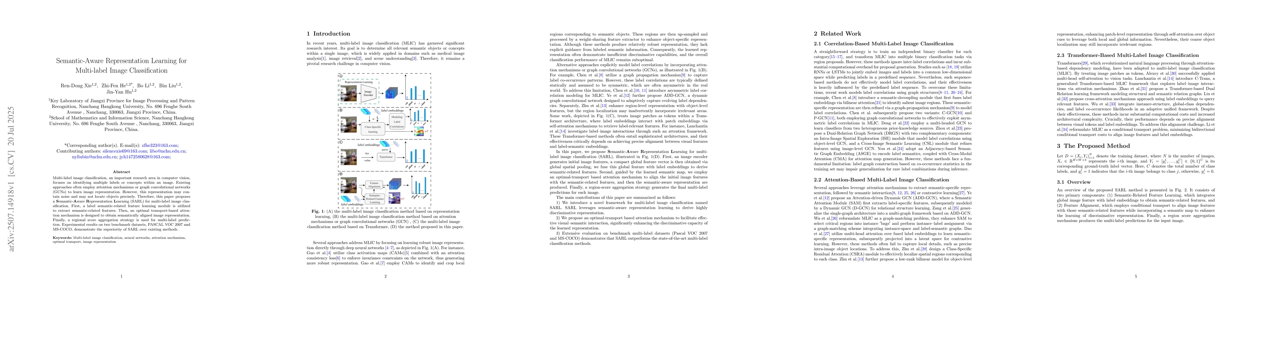 Multi-label image classification, an important research area in computer vision, focuses on identifying multiple labels or concepts within an image. Existing approaches often employ attention mechanisms or graph convolutional networks (GCNs) to learn image representation. However, this representation may contain noise and may not locate objects precisely. Therefore, this paper proposes a Semantic-Aware Representation Learning (SARL) for multi-label image classification. First, a label semantic-related feature learning module is utilized to extract semantic-related features. Then, an optimal transport-based attention mechanism is designed to obtain semantically aligned image representation. Finally, a regional score aggregation strategy is used for multi-label prediction. Experimental results on two benchmark datasets, PASCAL VOC 2007 and MS-COCO, demonstrate the superiority of SARL over existing methods.