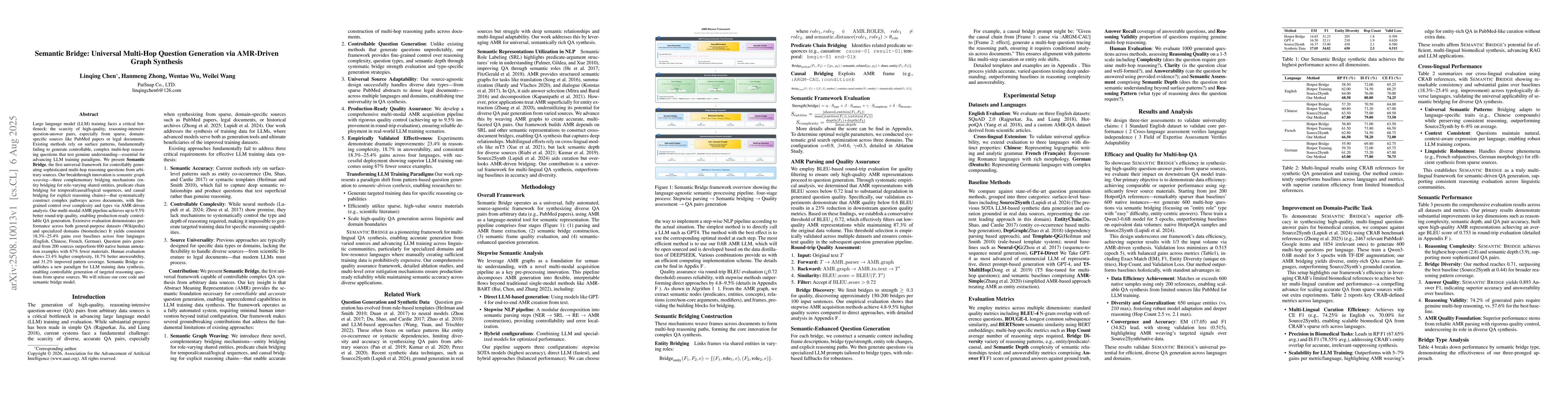 Large language model (LLM) training faces a critical bottleneck: the scarcity of high-quality, reasoning-intensive question-answer pairs, especially from sparse, domain-specific sources like PubMed papers or legal documents. Existing methods rely on surface patterns, fundamentally failing to generate controllable, complex multi-hop reasoning questions that test genuine understanding-essential for advancing LLM training paradigms. We present \textbf{Semantic Bridge}, the first universal framework for controllably generating sophisticated multi-hop reasoning questions from arbitrary sources. Our breakthrough innovation is \textit{semantic graph weaving}-three complementary bridging mechanisms (entity bridging for role-varying shared entities, predicate chain bridging for temporal/causal/logical sequences, and causal bridging for explicit reasoning chains)-that systematically construct complex pathways across documents, with fine-grained control over complexity and types via AMR-driven analysis. Our multi-modal AMR pipeline achieves up to 9.5% better round-trip quality, enabling production-ready controllable QA generation. Extensive evaluation demonstrates performance across both general-purpose datasets (Wikipedia) and specialized domains (biomedicine) It yields consistent 18.3%-25.4% gains over baselines across four languages (English, Chinese, French, German). Question pairs generated from 200 sources outperform 600 native human annotation examples with 67% fewer materials. Human evaluation shows 23.4% higher complexity, 18.7% better answerability, and 31.2% improved pattern coverage. Semantic Bridge establishes a new paradigm for LLM training data synthesis, enabling controllable generation of targeted reasoning questions from sparse sources. We will release our core code and semantic bridge model.