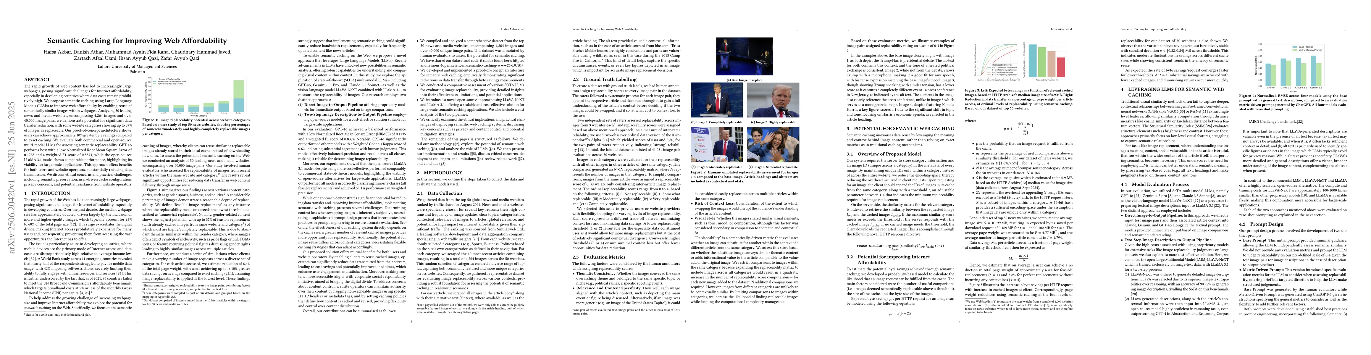 The rapid growth of web content has led to increasingly large webpages, posing significant challenges for Internet affordability, especially in developing countries where data costs remain prohibitively high. We propose semantic caching using Large Language Models (LLMs) to improve web affordability by enabling reuse of semantically similar images within webpages. Analyzing 50 leading news and media websites, encompassing 4,264 images and over 40,000 image pairs, we demonstrate potential for significant data transfer reduction, with some website categories showing up to 37% of images as replaceable. Our proof-of-concept architecture shows users can achieve approximately 10% greater byte savings compared to exact caching. We evaluate both commercial and open-source multi-modal LLMs for assessing semantic replaceability. GPT-4o performs best with a low Normalized Root Mean Square Error of 0.1735 and a weighted F1 score of 0.8374, while the open-source LLaMA 3.1 model shows comparable performance, highlighting its viability for large-scale applications. This approach offers benefits for both users and website operators, substantially reducing data transmission. We discuss ethical concerns and practical challenges, including semantic preservation, user-driven cache configuration, privacy concerns, and potential resistance from website operators