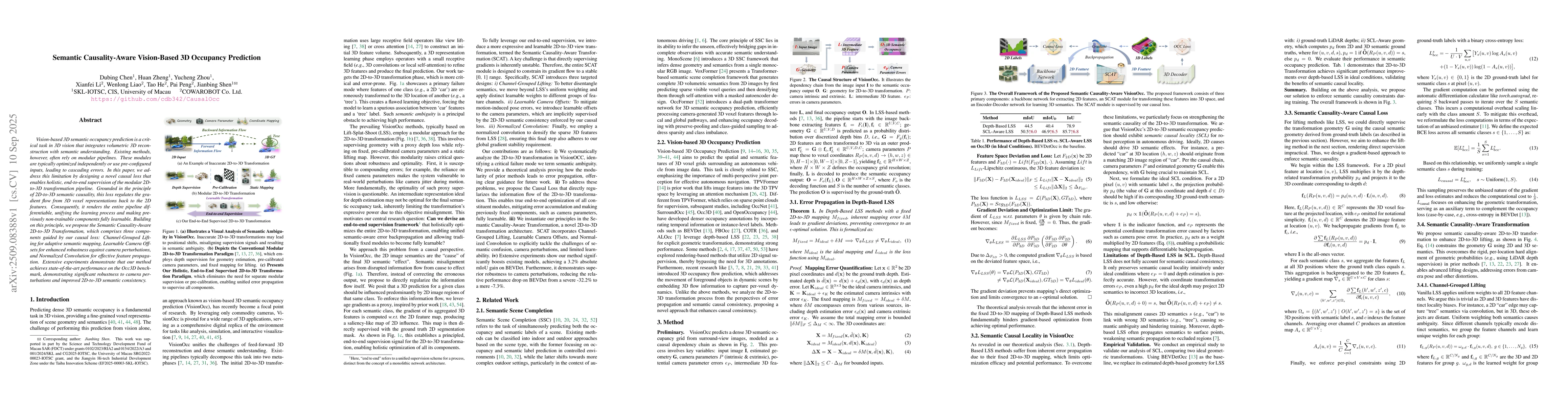Vision-based 3D semantic occupancy prediction is a critical task in 3D vision that integrates volumetric 3D reconstruction with semantic understanding. Existing methods, however, often rely on modular pipelines. These modules are typically optimized independently or use pre-configured inputs, leading to cascading errors. In this paper, we address this limitation by designing a novel causal loss that enables holistic, end-to-end supervision of the modular 2D-to-3D transformation pipeline. Grounded in the principle of 2D-to-3D semantic causality, this loss regulates the gradient flow from 3D voxel representations back to the 2D features. Consequently, it renders the entire pipeline differentiable, unifying the learning process and making previously non-trainable components fully learnable. Building on this principle, we propose the Semantic Causality-Aware 2D-to-3D Transformation, which comprises three components guided by our causal loss: Channel-Grouped Lifting for adaptive semantic mapping, Learnable Camera Offsets for enhanced robustness against camera perturbations, and Normalized Convolution for effective feature propagation. Extensive experiments demonstrate that our method achieves state-of-the-art performance on the Occ3D benchmark, demonstrating significant robustness to camera perturbations and improved 2D-to-3D semantic consistency.