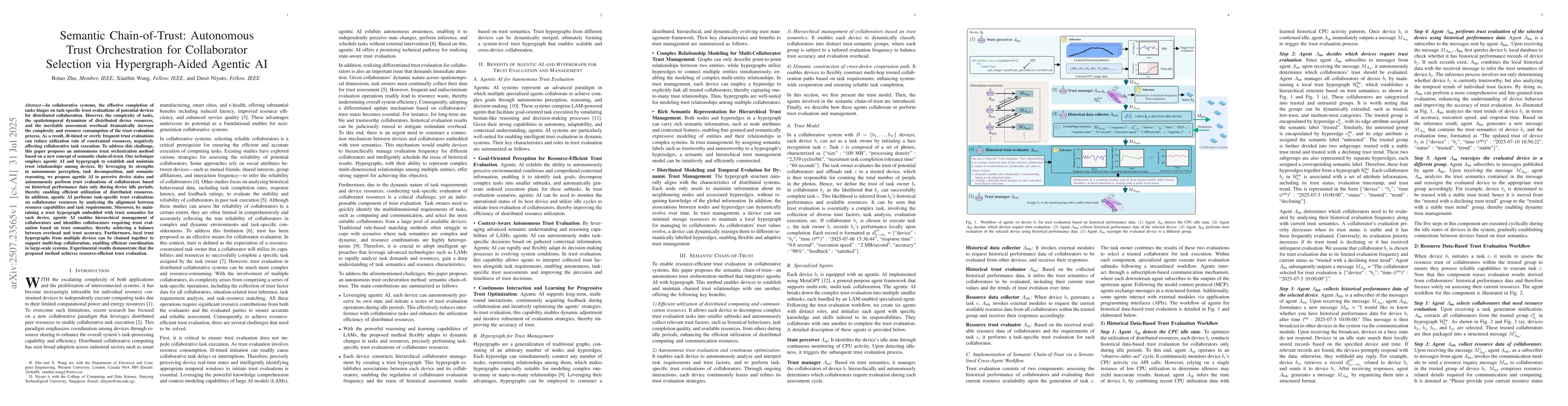 In collaborative systems, the effective completion of tasks hinges on task-specific trust evaluations of potential devices for distributed collaboration. However, the complexity of tasks, the spatiotemporal dynamism of distributed device resources, and the inevitable assessment overhead dramatically increase the complexity and resource consumption of the trust evaluation process. As a result, ill-timed or overly frequent trust evaluations can reduce utilization rate of constrained resources, negatively affecting collaborative task execution. To address this challenge, this paper proposes an autonomous trust orchestration method based on a new concept of semantic chain-of-trust. Our technique employs agentic AI and hypergraph to establish and maintain trust relationships among devices. By leveraging its strengths in autonomous perception, task decomposition, and semantic reasoning, we propose agentic AI to perceive device states and autonomously perform trust evaluations of collaborators based on historical performance data only during device idle periods, thereby enabling efficient utilization of distributed resources. In addition, agentic AI performs task-specific trust evaluations on collaborator resources by analyzing the alignment between resource capabilities and task requirements. Moreover, by maintaining a trust hypergraph embedded with trust semantics for each device, agentic AI enables hierarchical management of collaborators and identifies collaborators requiring trust evaluation based on trust semantics, thereby achieving a balance between overhead and trust accuracy. Furthermore, local trust hypergraphs from multiple devices can be chained together to support multi-hop collaboration, enabling efficient coordination in large-scale systems. Experimental results demonstrate that the proposed method achieves resource-efficient trust evaluation.