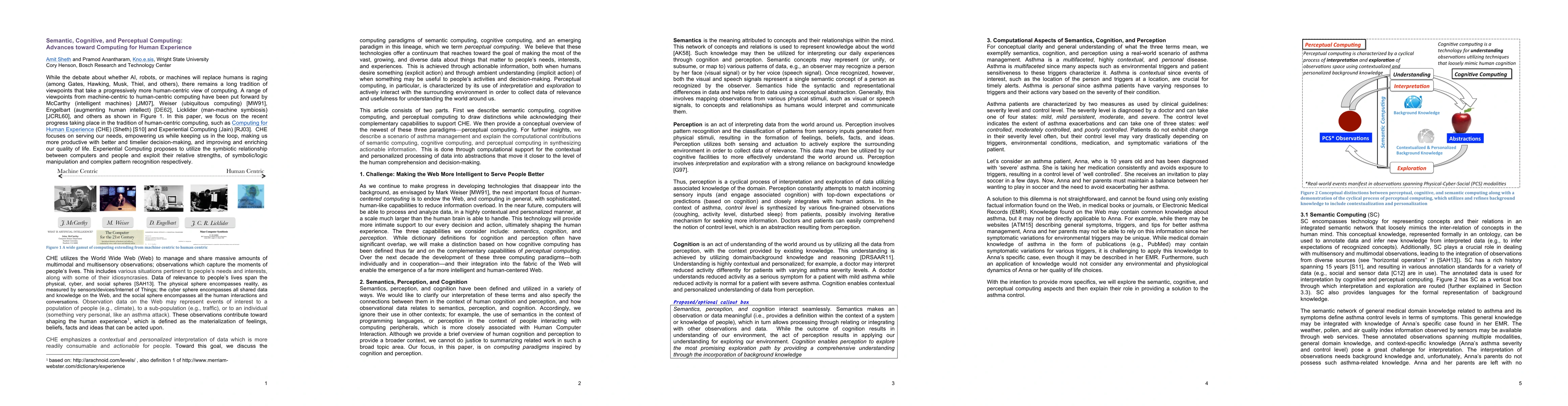 The World Wide Web continues to evolve and serve as the infrastructure for carrying massive amounts of multimodal and multisensory observations. These observations capture various situations pertinent to people's needs and interests along with all their idiosyncrasies. To support human-centered computing that empower people in making better and timely decisions, we look towards computation that is inspired by human perception and cognition. Toward this goal, we discuss computing paradigms of semantic computing, cognitive computing, and an emerging aspect of computing, which we call perceptual computing. In our view, these offer a continuum to make the most out of vast, growing, and diverse data pertinent to human needs and interests. We propose details of perceptual computing characterized by interpretation and exploration operations comparable to the interleaving of bottom and top brain processing. This article consists of two parts. First we describe semantic computing, cognitive computing, and perceptual computing to lay out distinctions while acknowledging their complementary capabilities. We then provide a conceptual overview of the newest of these three paradigms--perceptual computing. For further insights, we focus on an application scenario of asthma management converting massive, heterogeneous and multimodal (big) data into actionable information or smart data.