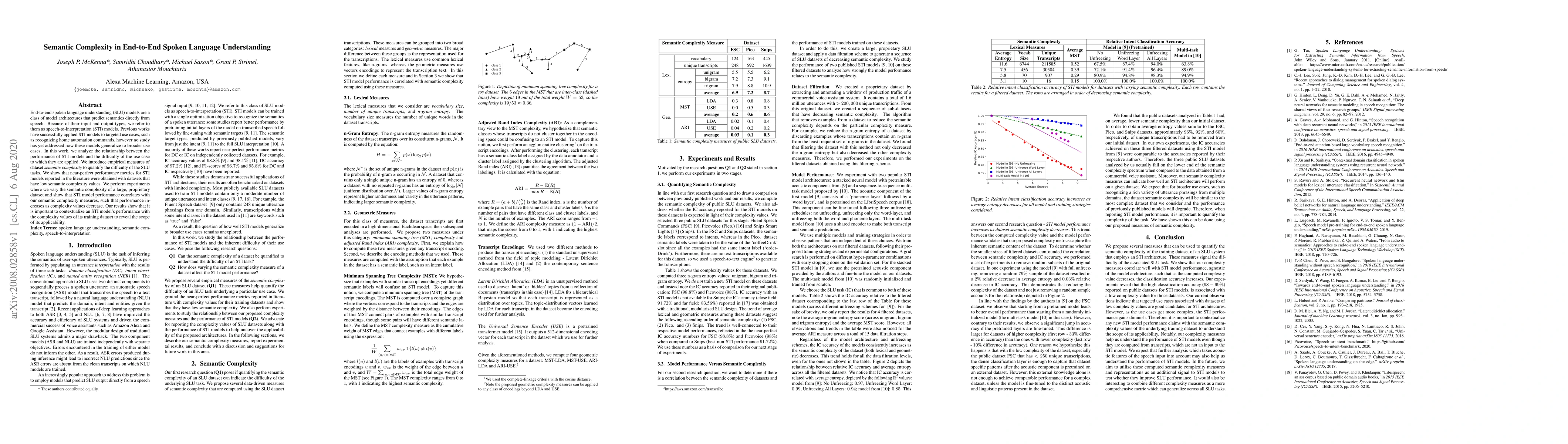 This paper investigates the relationship between the performance of end-to-end spoken language understanding models and the semantic complexity of their training datasets. It finds that high performance is often achieved with low complexity datasets, highlighting the importance of considering dataset complexity when evaluating model applicability.