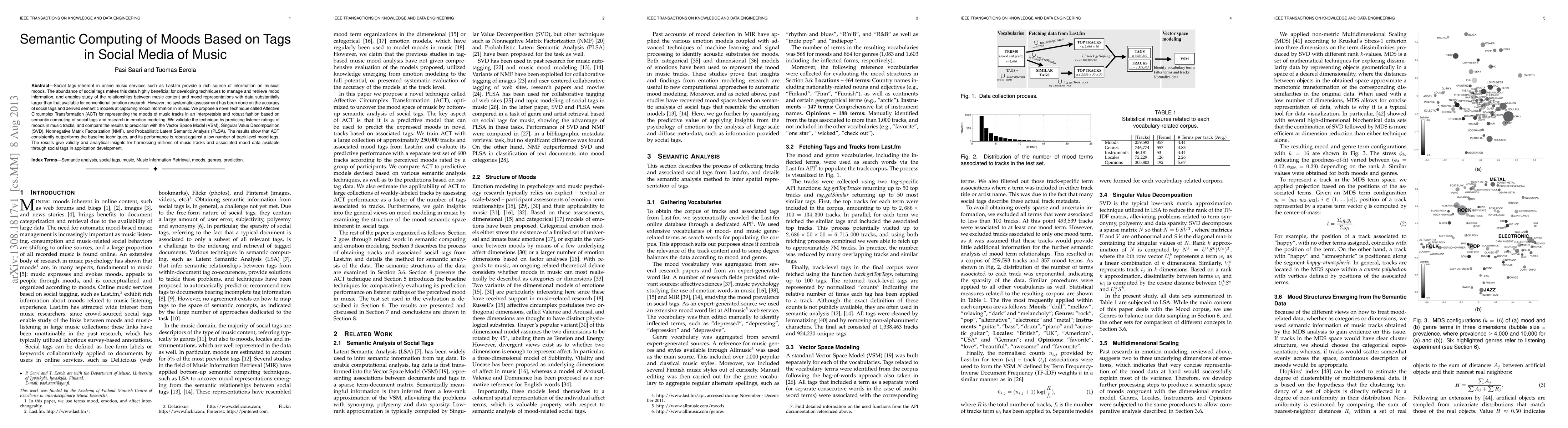 The development of a novel latent semantic analysis model for music derived from social tags.