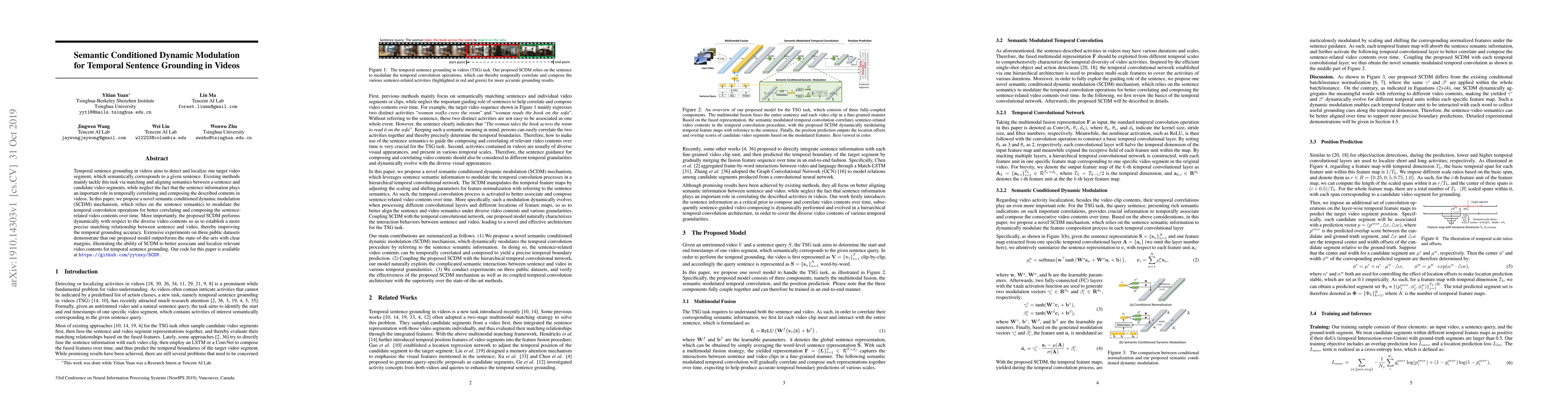 This paper introduces a Semantic Conditioned Dynamic Modulation (SCDM) mechanism to enhance temporal sentence grounding in videos by dynamically modulating temporal convolution operations based on sentence semantics, leading to improved accuracy in matching and localizing video segments corresponding to given sentences. Experiments show significant performance gains over existing methods on three public datasets.