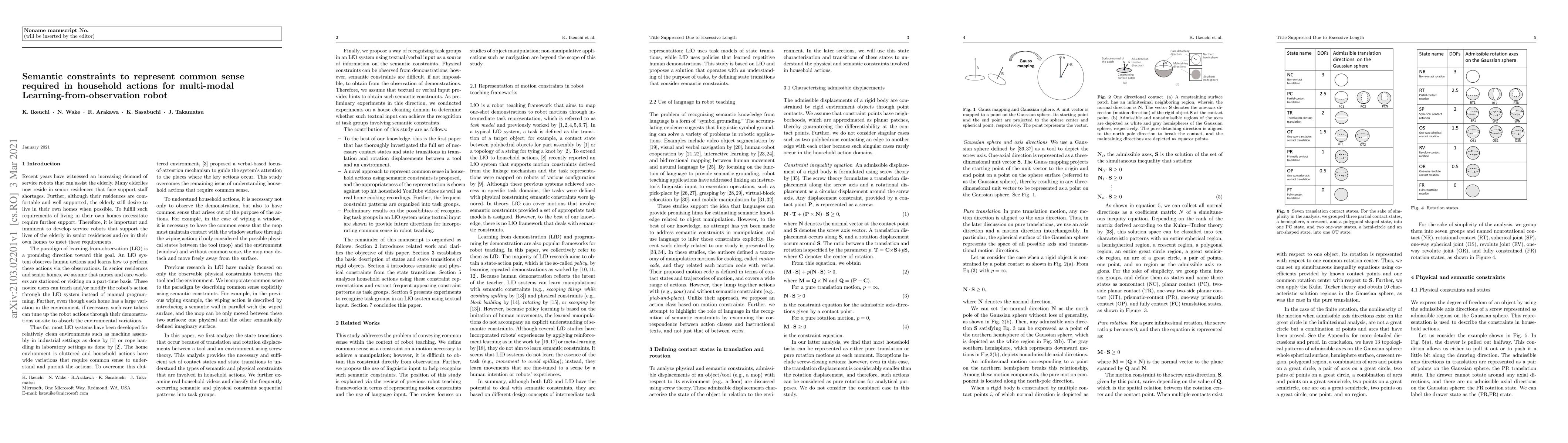 The paradigm of learning-from-observation (LfO) enables a robot to learn how to perform actions by observing human-demonstrated actions. Previous research in LfO have mainly focused on the industrial domain which only consist of the observable physical constraints between a manipulating tool and the robot's working environment. In order to extend this paradigm to the household domain which consists non-observable constraints derived from a human's common sense; we introduce the idea of semantic constraints. The semantic constraints are represented similar to the physical constraints by defining a contact with an imaginary semantic environment. We thoroughly investigate the necessary and sufficient set of contact state and state transitions to understand the different types of physical and semantic constraints. We then apply our constraint representation to analyze various actions in top hit household YouTube videos and real home cooking recordings. We further categorize the frequently appearing constraint patterns into physical, semantic, and multistage task groups and verify that these groups are not only necessary but a sufficient set for covering standard household actions. Finally, we conduct a preliminary experiment using textual input to explore the possibilities of combining verbal and visual input for recognizing the task groups. Our results provide promising directions for incorporating common sense in the literature of robot teaching.