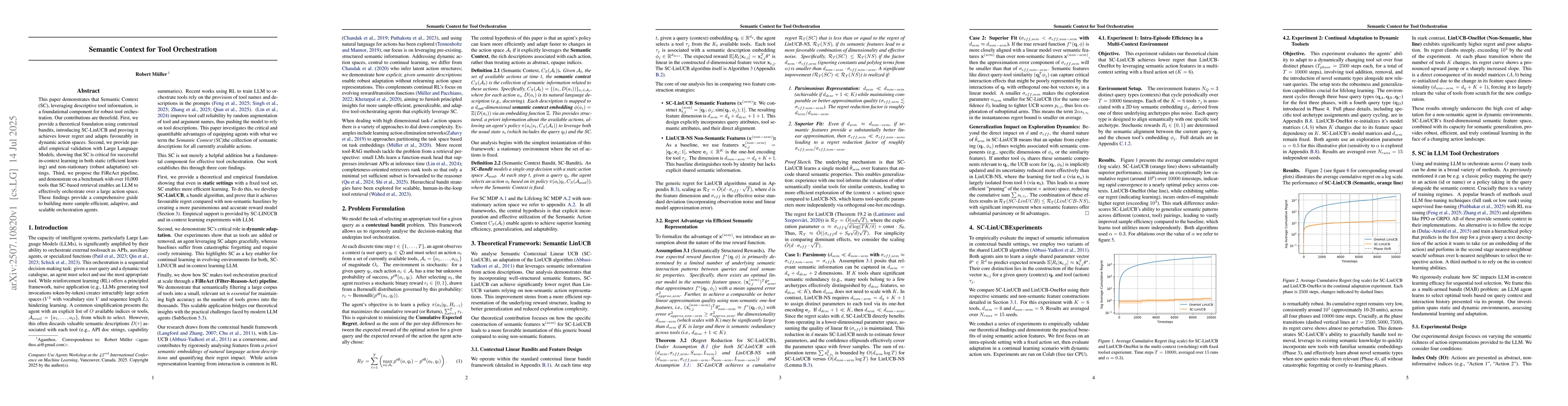 This paper demonstrates that Semantic Context (SC), leveraging descriptive tool information, is a foundational component for robust tool orchestration. Our contributions are threefold. First, we provide a theoretical foundation using contextual bandits, introducing SC-LinUCB and proving it achieves lower regret and adapts favourably in dynamic action spaces. Second, we provide parallel empirical validation with Large Language Models, showing that SC is critical for successful in-context learning in both static (efficient learning) and non-stationary (robust adaptation) settings. Third, we propose the FiReAct pipeline, and demonstrate on a benchmark with over 10,000 tools that SC-based retrieval enables an LLM to effectively orchestrate over a large action space. These findings provide a comprehensive guide to building more sample-efficient, adaptive, and scalable orchestration agents.