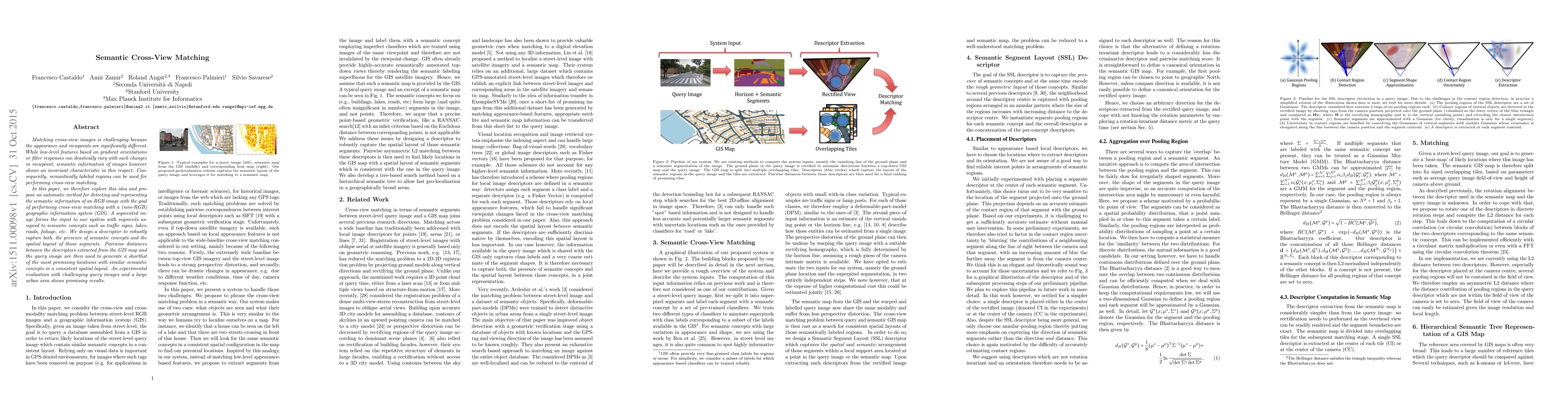 This research introduces a method for cross-view image matching using semantic information. It segments an input image into regions labeled with semantic concepts, then designs a descriptor to capture both semantic presence and spatial layout. This descriptor is used to find matching locations in a GIS map, demonstrating promising results with challenging query images in urban areas.