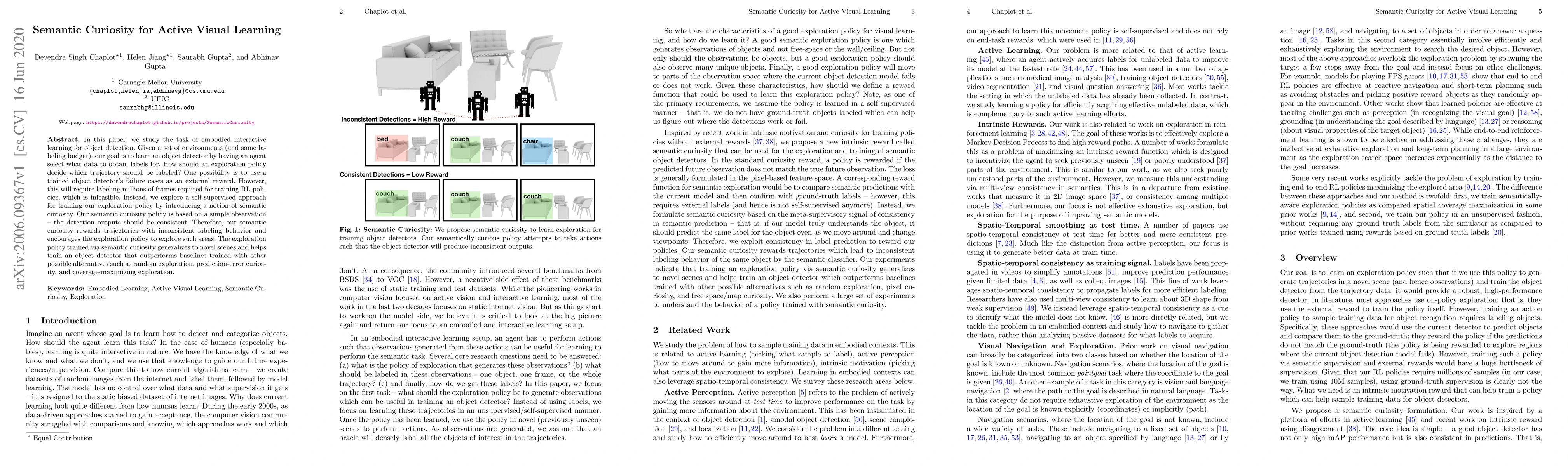 This paper proposes a self-supervised approach using semantic curiosity to guide an exploration policy for active visual learning in object detection. The policy rewards trajectories with inconsistent labeling behavior, leading to improved performance over baselines.