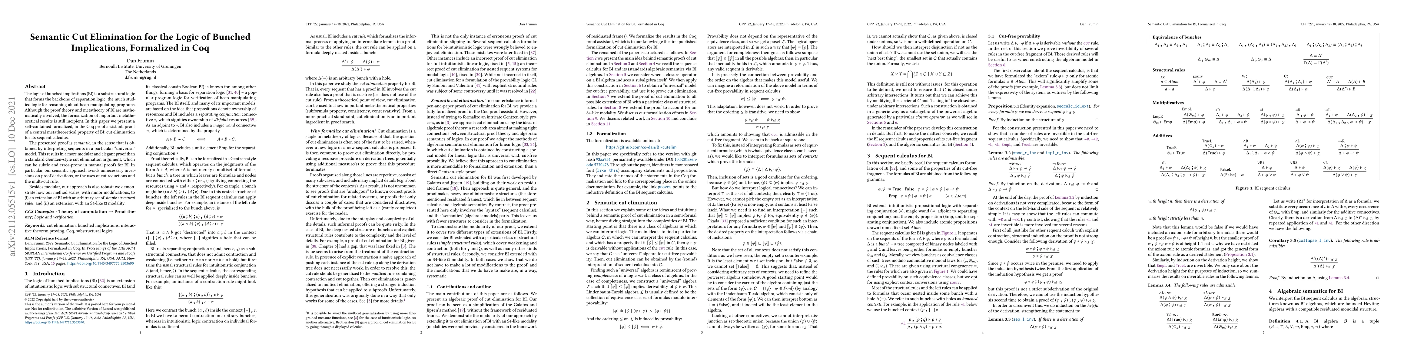 This paper presents a formalized proof in Coq of cut elimination for the logic of bunched implications (BI), achieved through a semantic interpretation in a universal model, resulting in a more modular and robust proof compared to traditional Gentzen-style methods. The approach also scales effectively to extensions of BI with additional structural rules and modal operators.