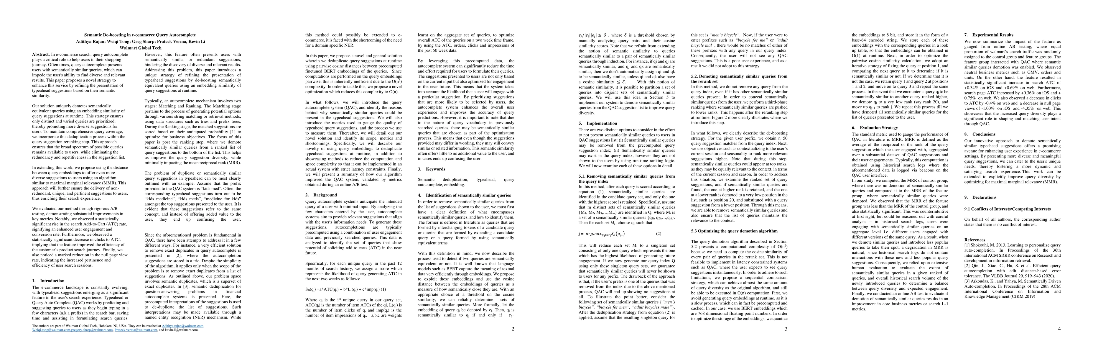 The introduction of semantic de-boosting in e-commerce query autocomplete, using embedding similarity to demote redundant queries and improve suggestion diversity.