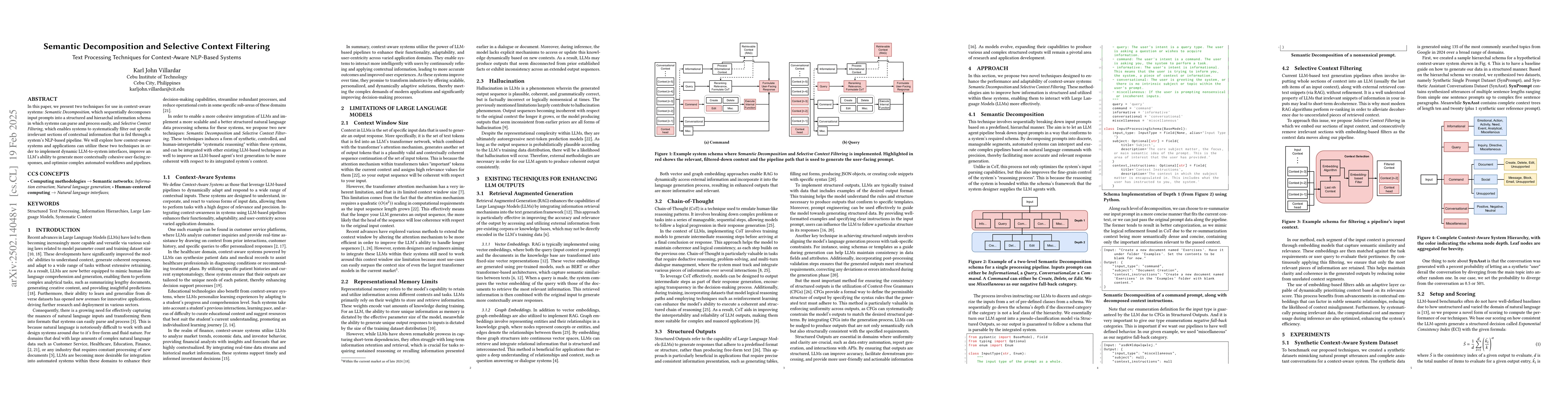 The paper proposes two techniques, Semantic Decomposition and Selective Context Filtering, for context-aware NLP systems. Semantic Decomposition sequentially decomposes input prompts into a structured, hierarchical information schema. Selective Context Filtering enables systems to systematically filter out irrelevant sections of contextual information.