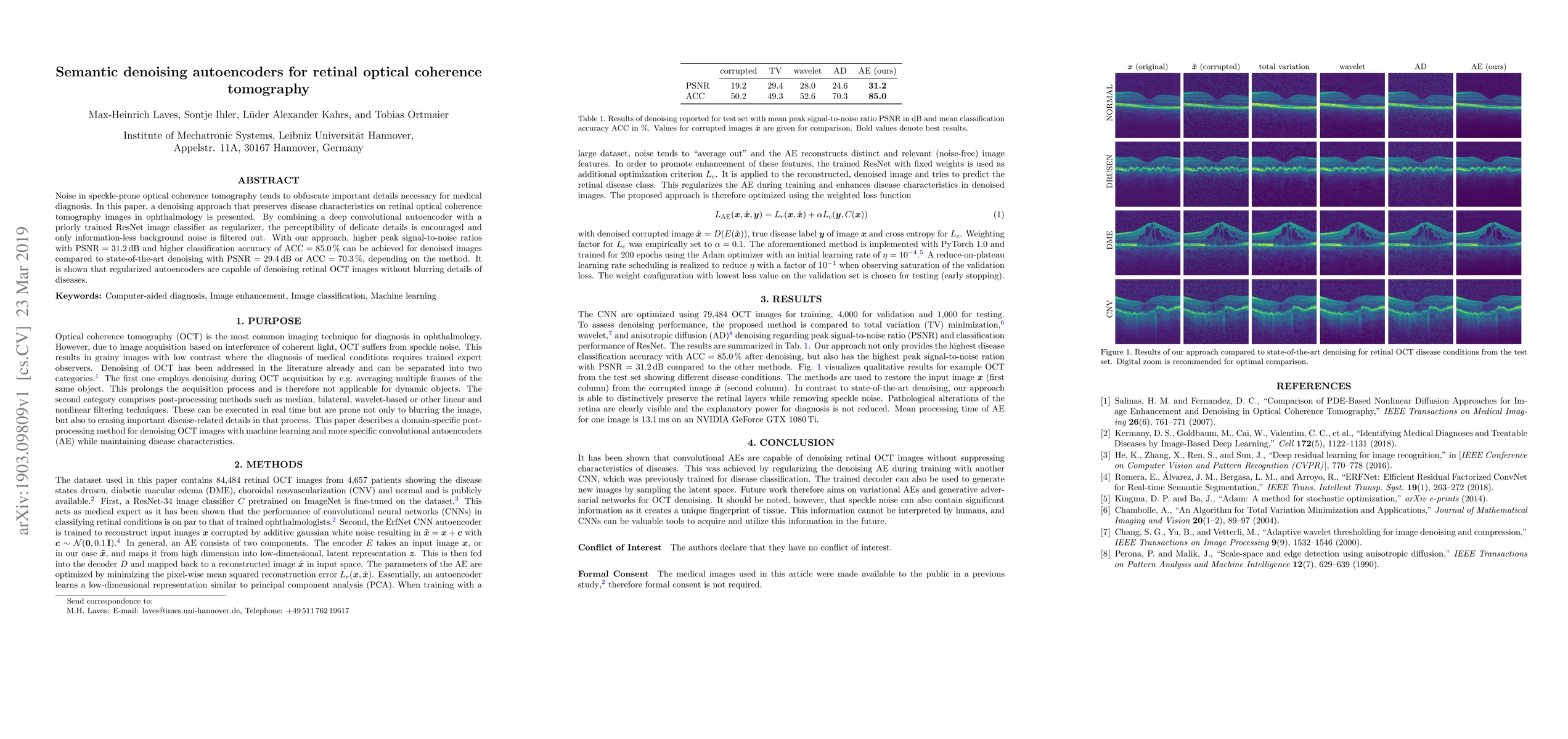 This paper proposes a semantic denoising autoencoder combining deep convolutional autoencoders with ResNet classifiers to enhance retinal optical coherence tomography images, achieving higher peak signal-to-noise ratios and classification accuracy while preserving disease-related details. The method outperforms existing techniques with PSNR of 31.2 dB and 85.0% classification accuracy.
