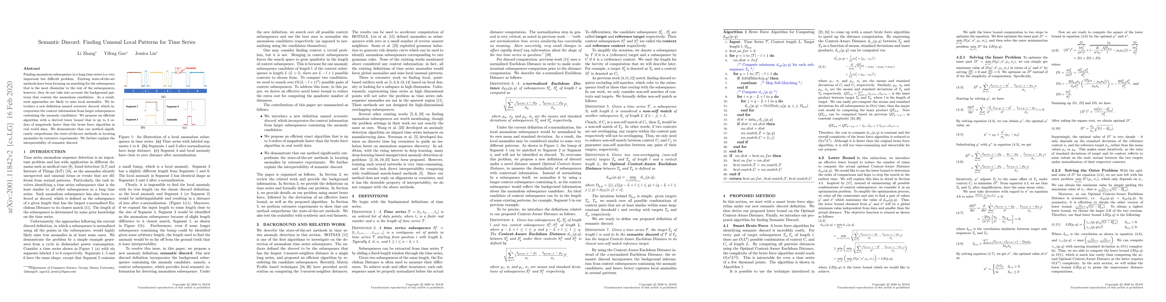 Finding anomalous subsequence in a long time series is a very important but difficult problem. Existing state-of-the-art methods have been focusing on searching for the subsequence that is the most dissimilar to the rest of the subsequences; however, they do not take into account the background patterns that contain the anomalous candidates. As a result, such approaches are likely to miss local anomalies. We introduce a new definition named \textit{semantic discord}, which incorporates the context information from larger subsequences containing the anomaly candidates. We propose an efficient algorithm with a derived lower bound that is up to 3 orders of magnitude faster than the brute force algorithm in real world data. We demonstrate that our method significantly outperforms the state-of-the-art methods in locating anomalies by extensive experiments. We further explain the interpretability of semantic discord.